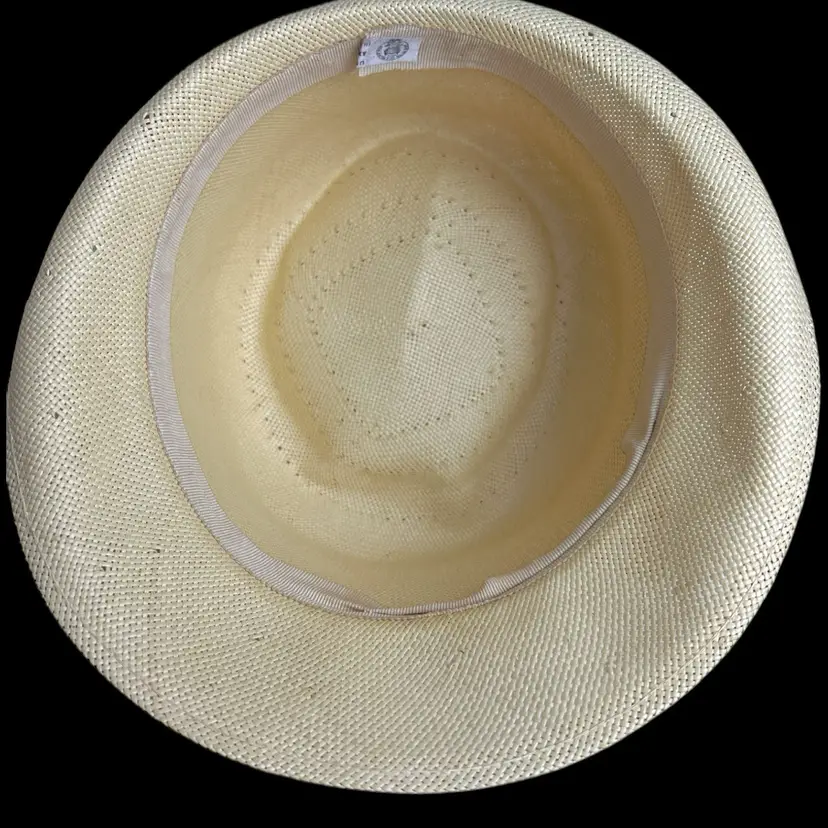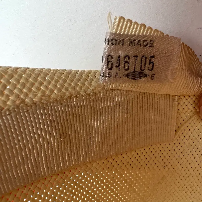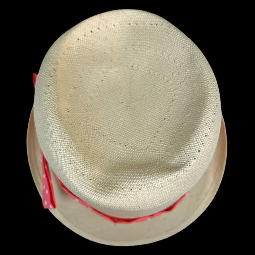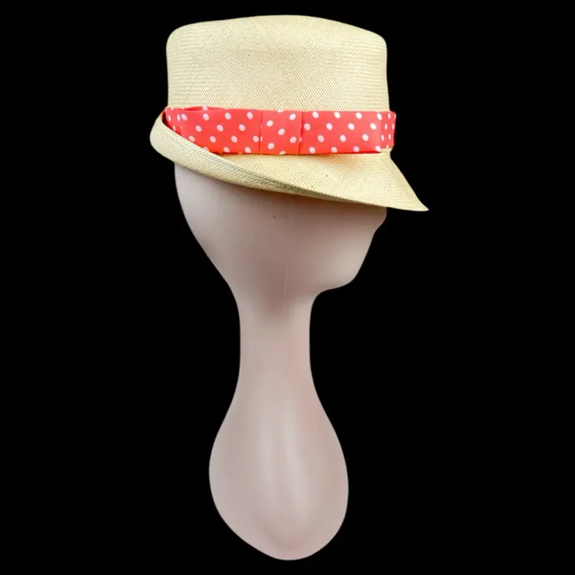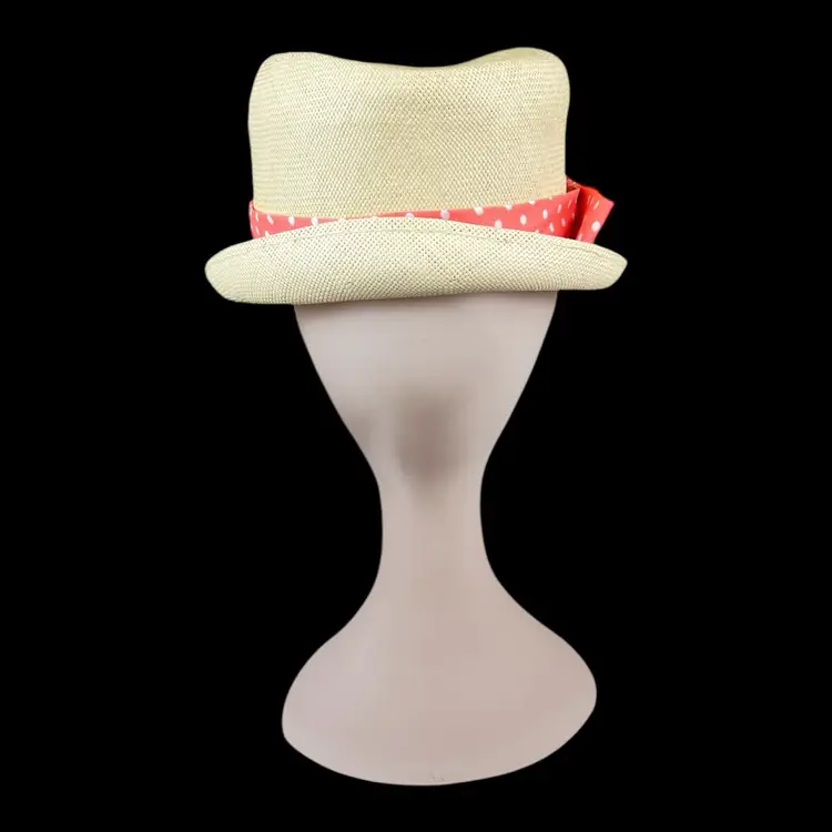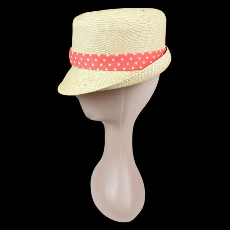 This vintage fedora hat is a stylish addition to any collection. Made from natural straw, this silk coral white polka dot band hat is a Union Made original from the 1960s. The tailored look and beige color make it a versatile accessory for any outfit. The hat is sized at OS and has a classic mid century fedora style. Perfect for vintage accessory collectors or anyone looking to add a unique touch to their wardrobe. The silk hat band is removable so let your creativity run wild!