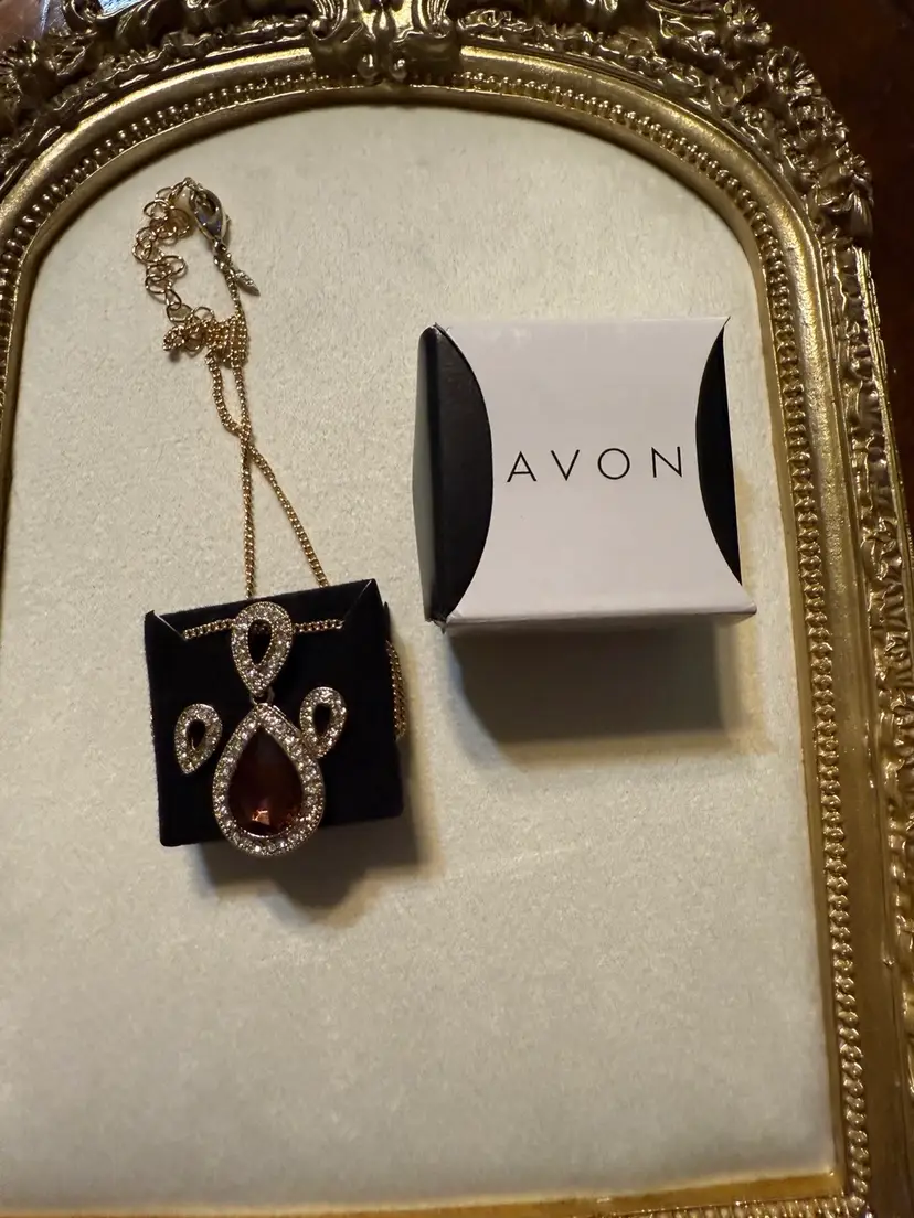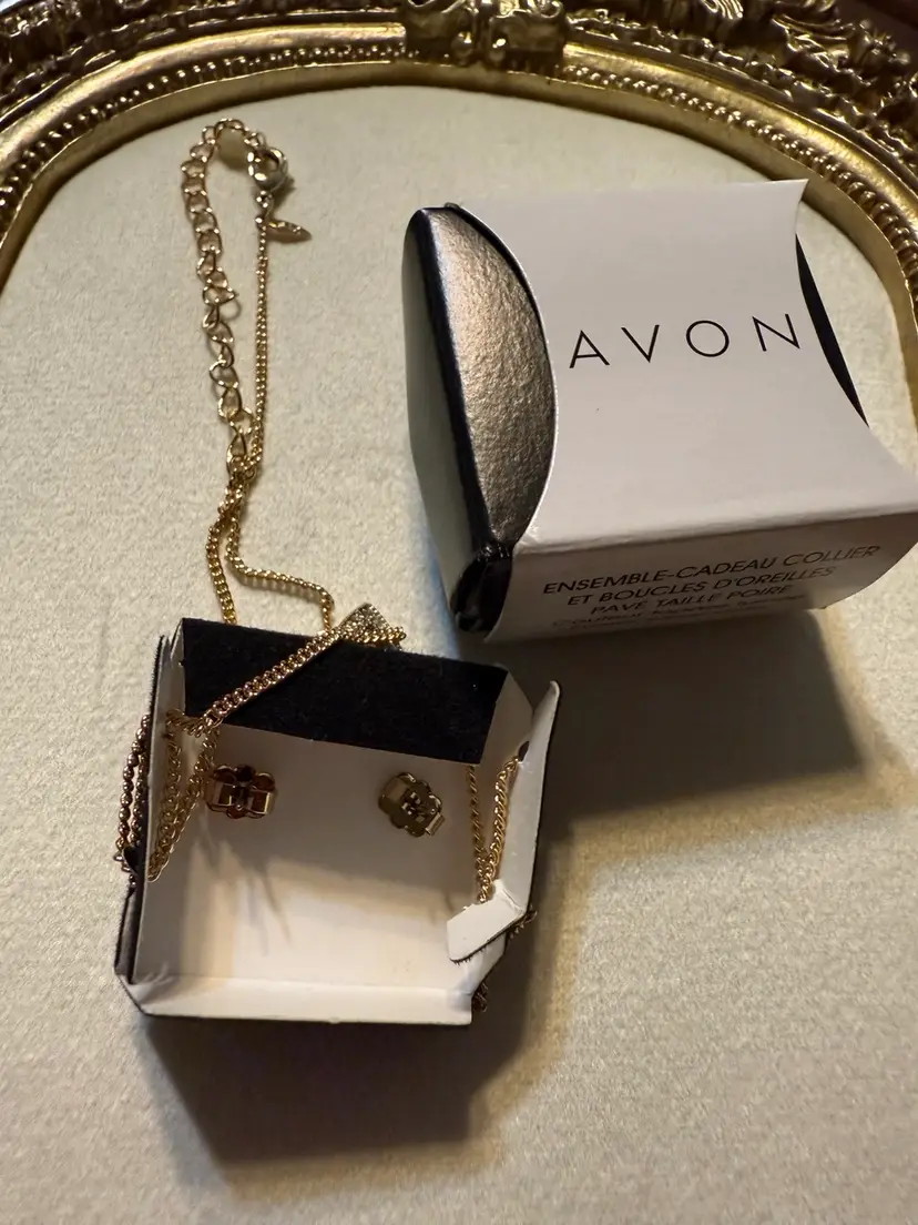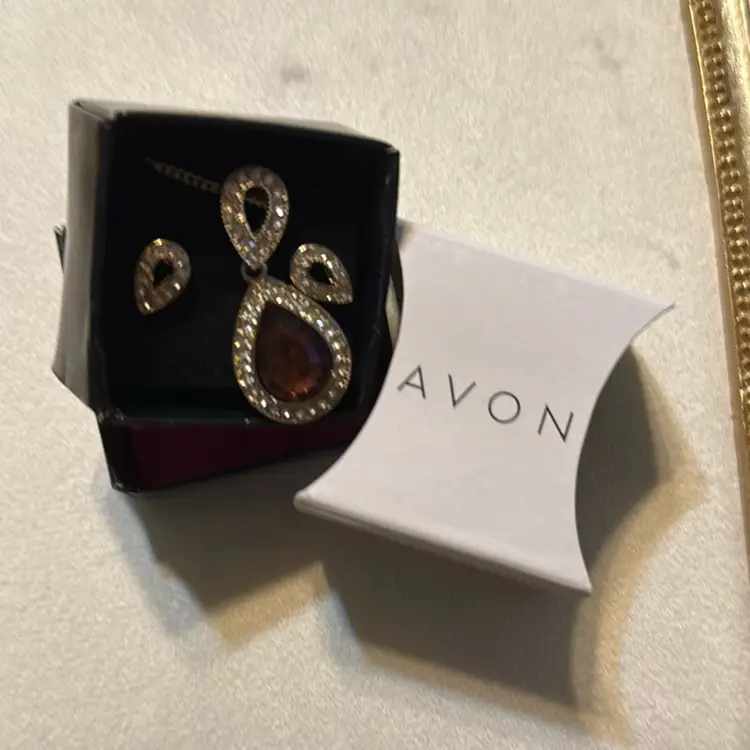 Vintage AVON NOS gold tone Smokey topaz set Pierced earrings 16”-20” necklace