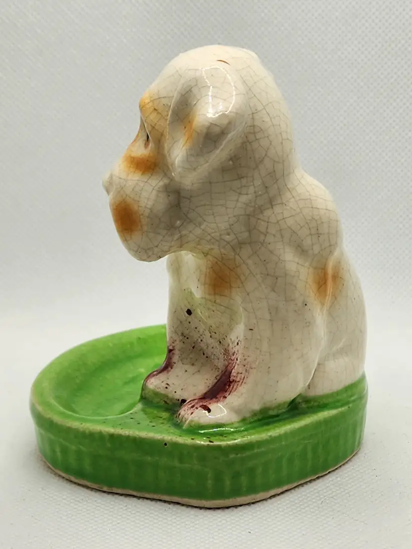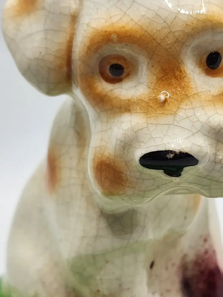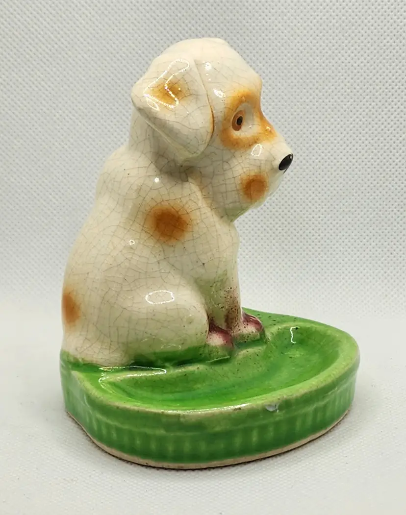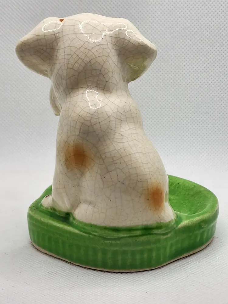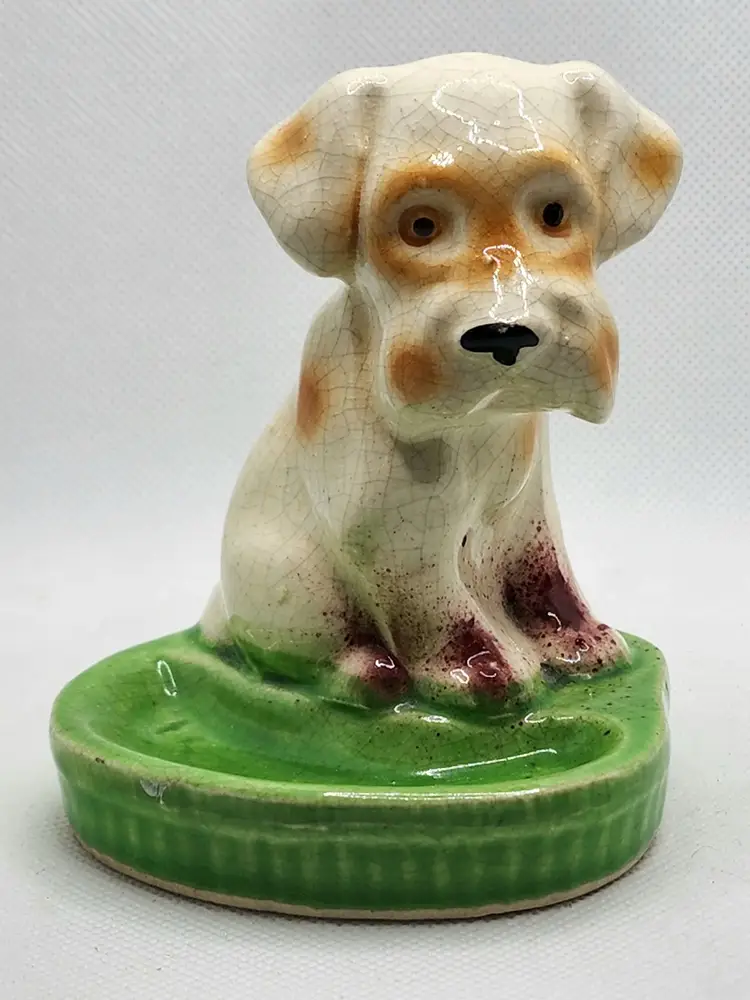 Dog is all over off white with butterscotch & rust accents on green platform.