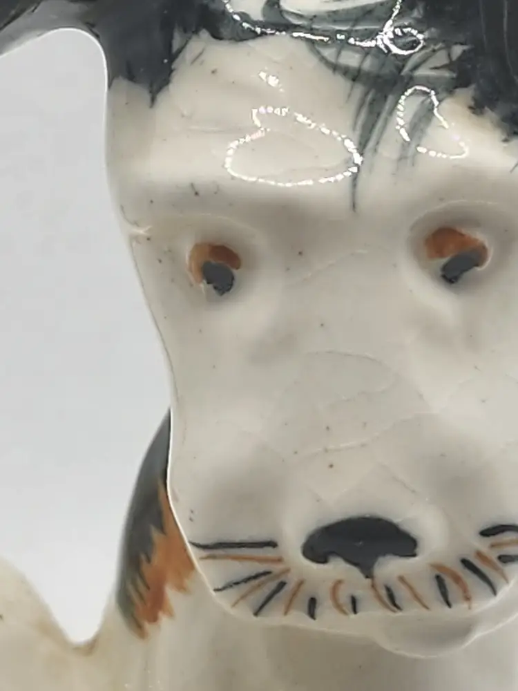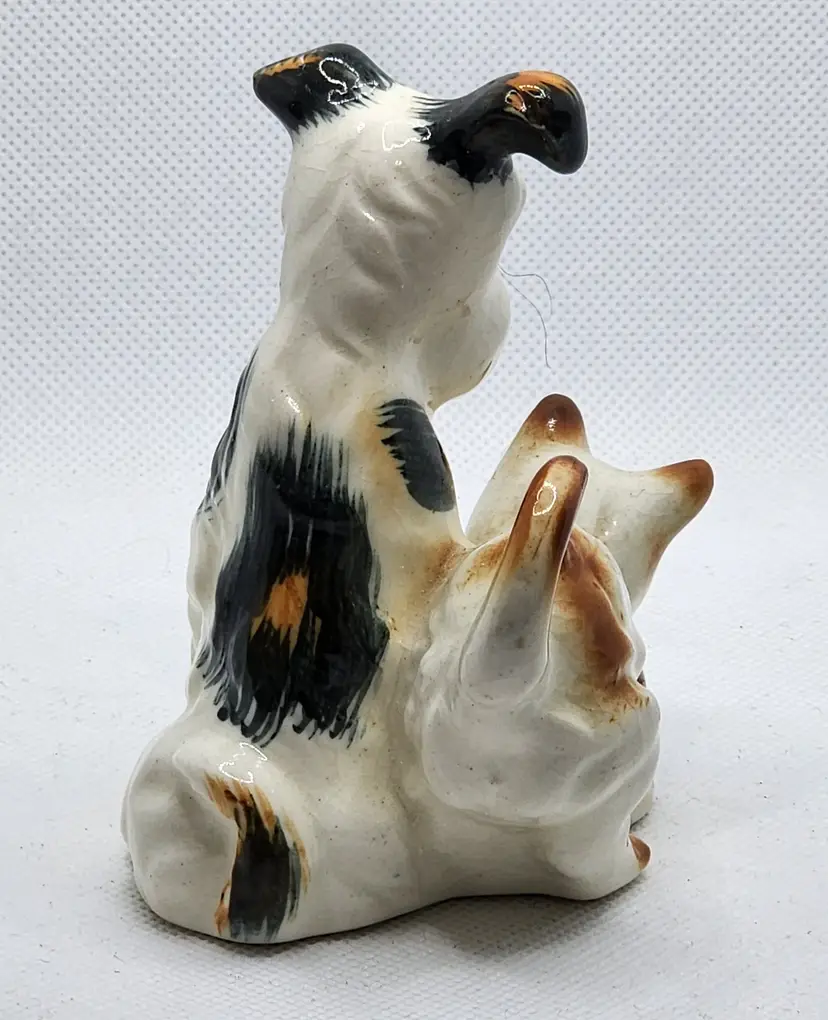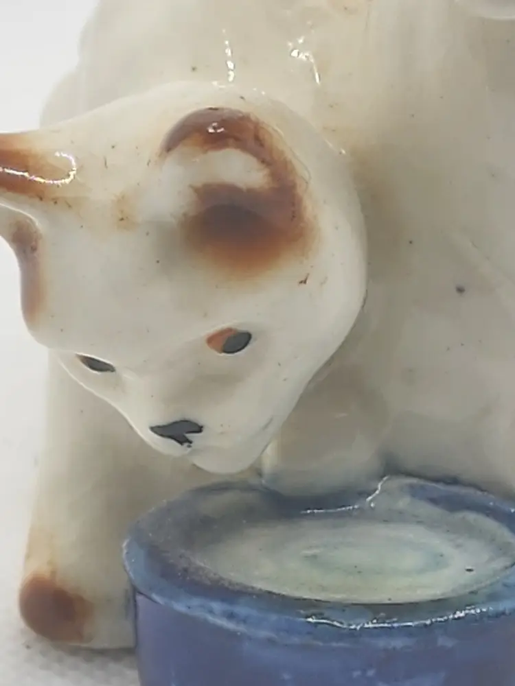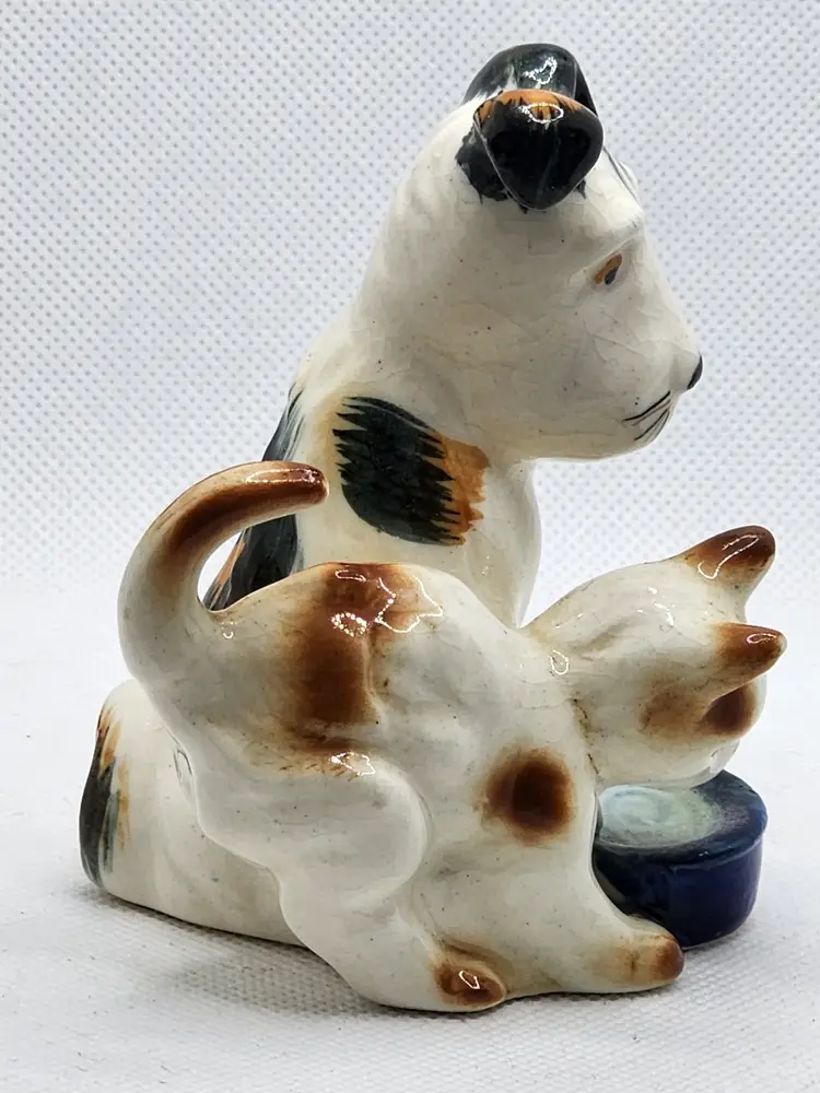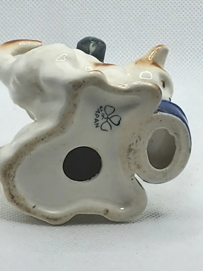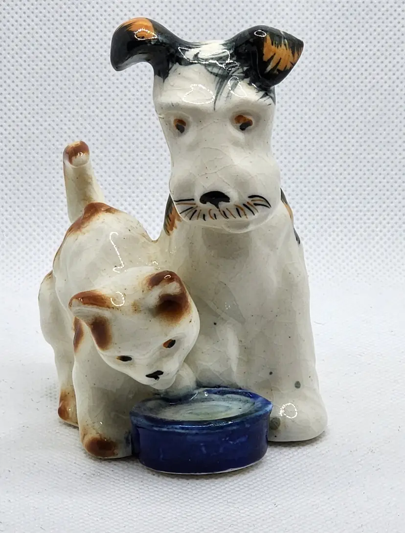 Vintage Japan figurine of a white terrier with black & orange markings & a white & orange cat with a bowl of water. No chips or cracks but some crazing present. Marked Japan with a three leaf clover.