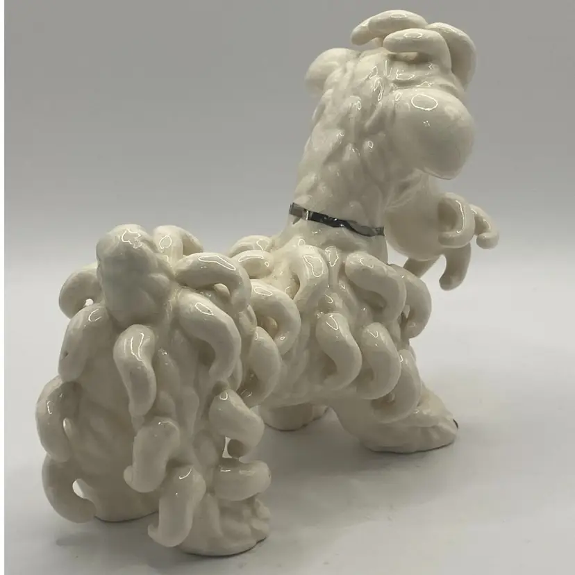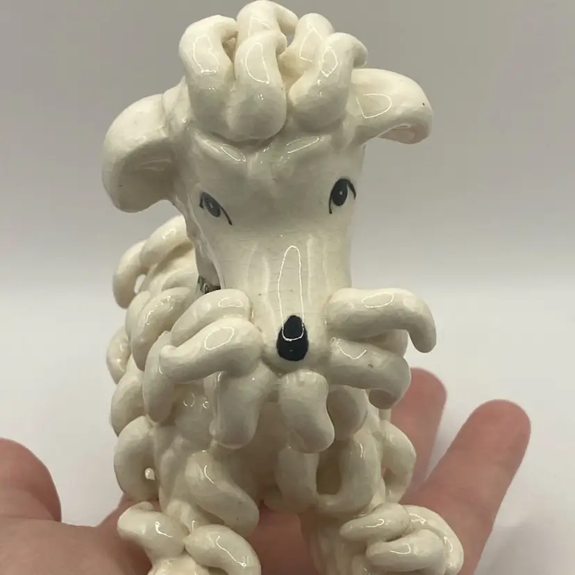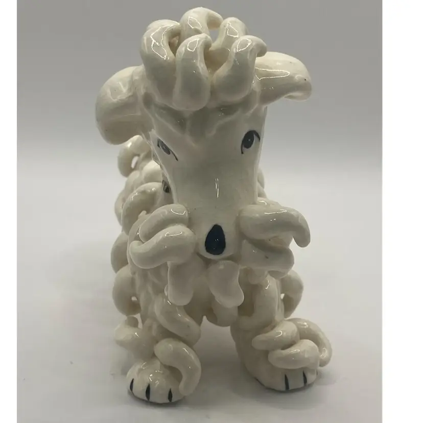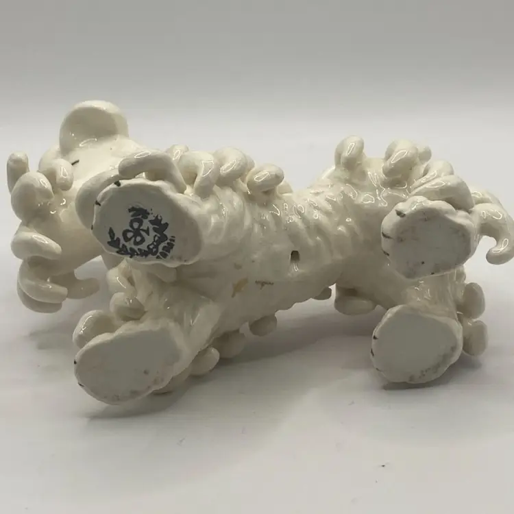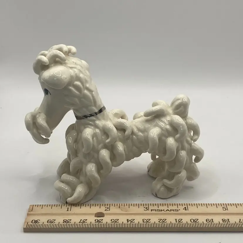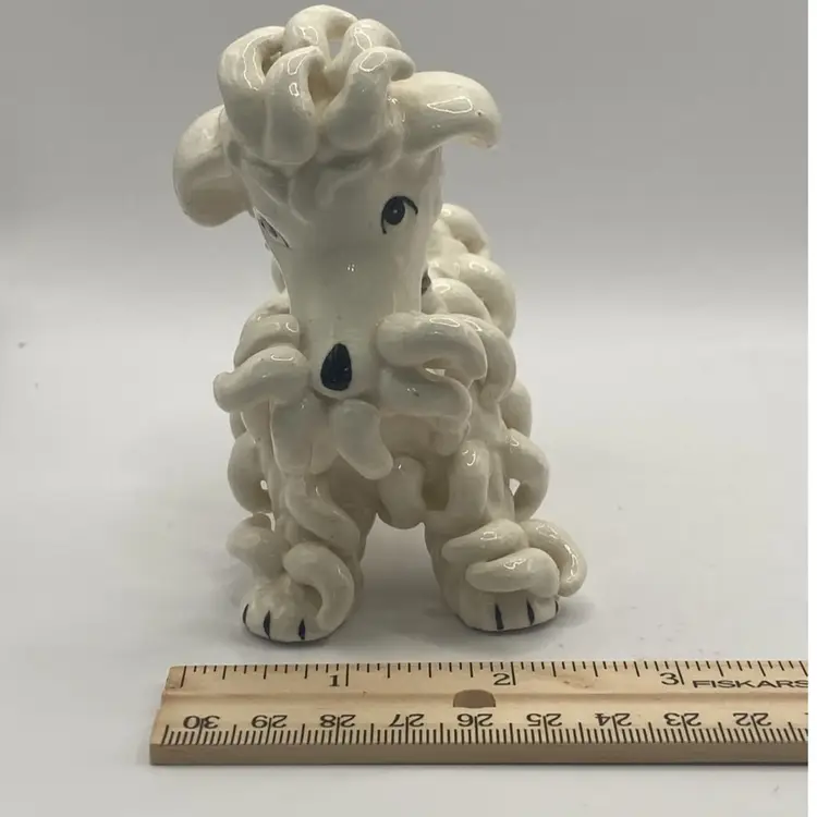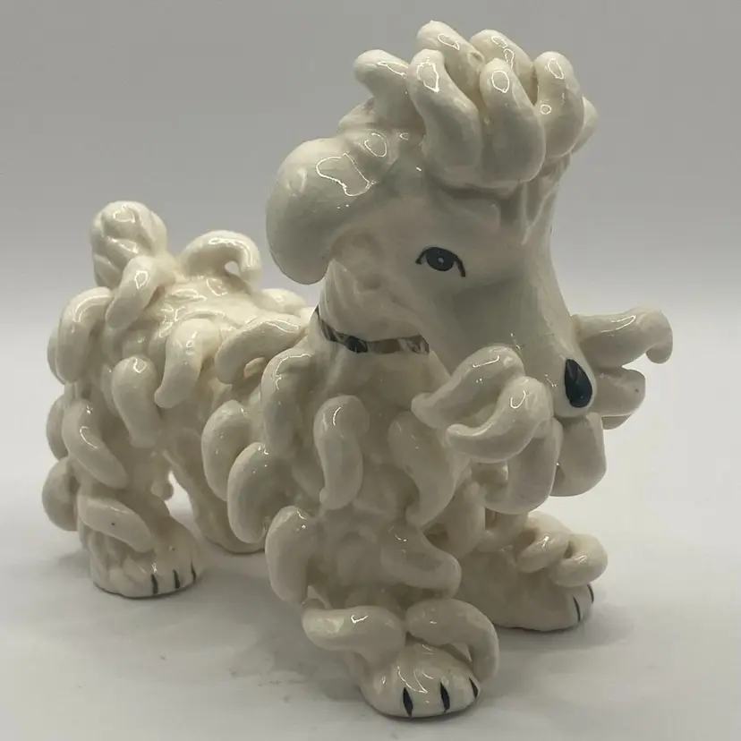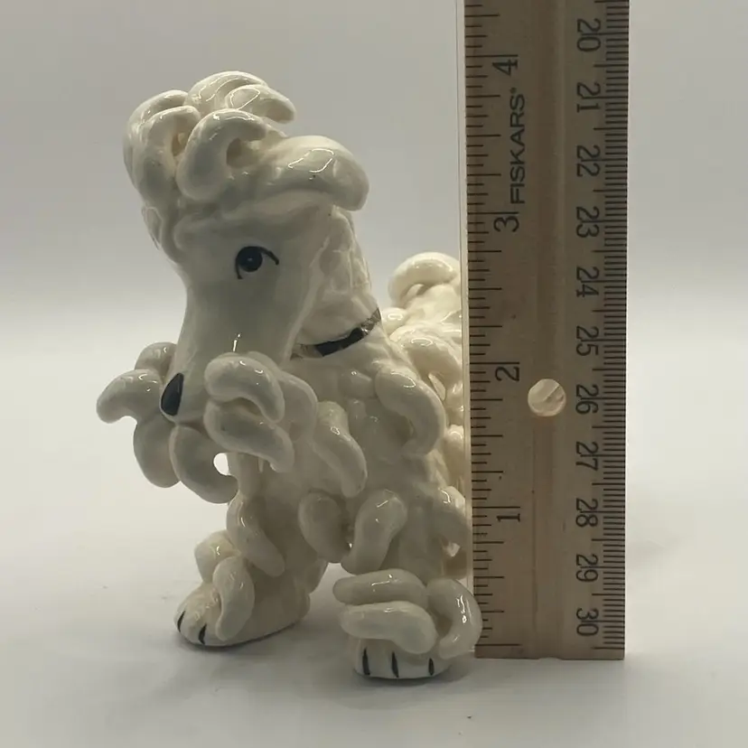 Just look at his “spaghetti noodles”. This pup is handsome, and a bit different, but he’s simply fantastic. No chips or breaks, just a little crazing on his face. In very good vintage condition.