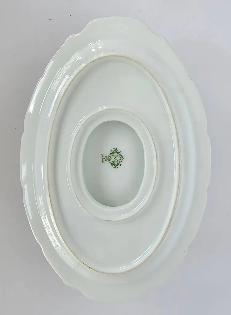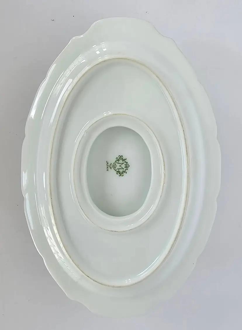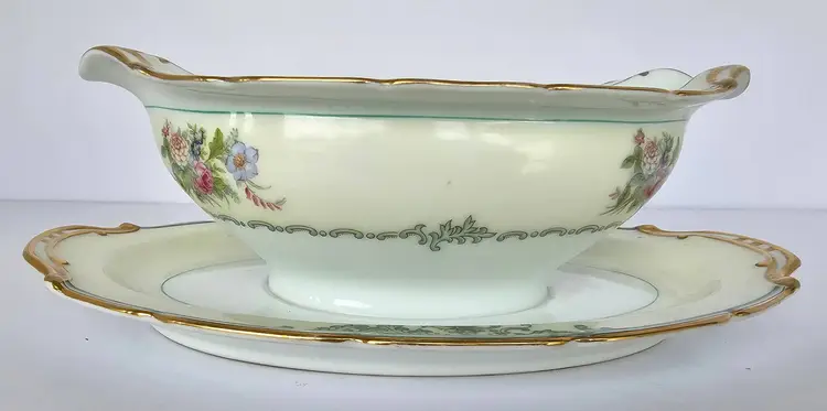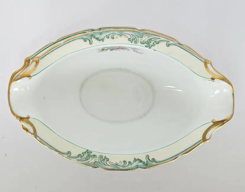 Floral design, Scalloped, Gold trim edging. Double Sided Pourers 9" l x 6" w x 3 1/4" h Beautiful condition