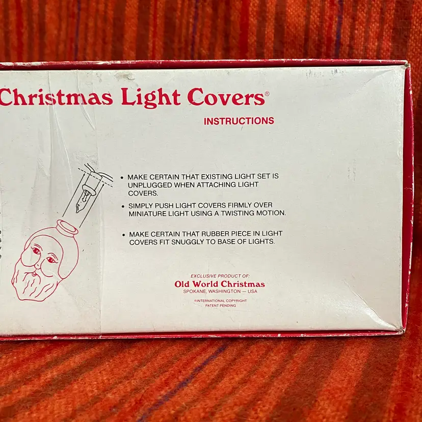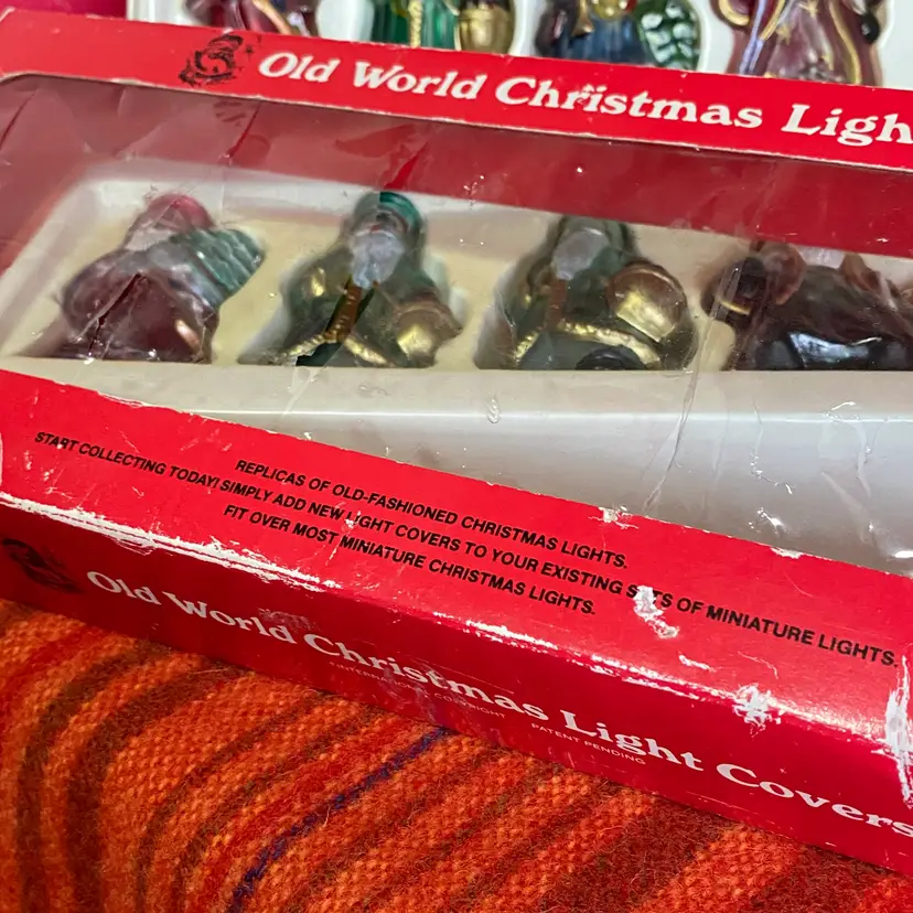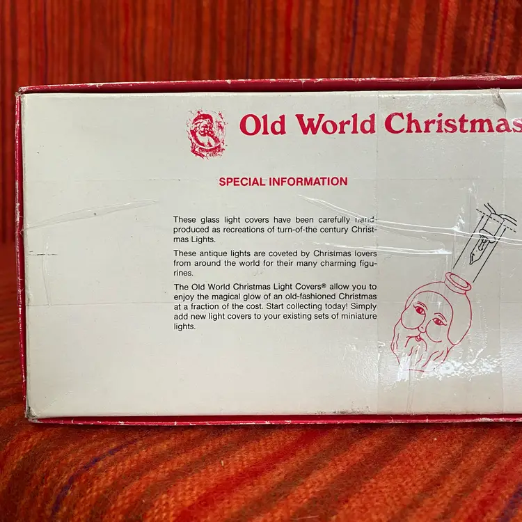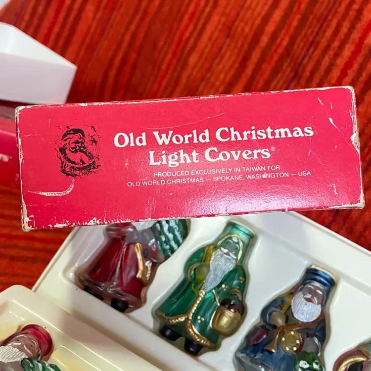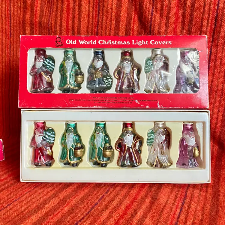 Two sets of six vintage Old World Christmas string light covers made of glass in various Santa shapes and colors in original packaging. Hand painted. The packaging states these are replicas of early 1900s ornaments. Old World Christmas is the brand name and research indicated they were established in 1979. There is a blue painted santa in one box, at some point this piece was replaced with another green one in the second box. In total there are four red, three green, two clear, one blue and two purple. They have a rubber lined hole at the top that will fit snugly around standard sized string lights. The rubber is not stiff from age and should function as intended. No broken pieces. There are minor instances of paint wear. The boxes have wear and tear including punctures in the cellophane and also a strip of packing tape on each. Made in Taiwan. Each light cover measures about 3.25" tall.