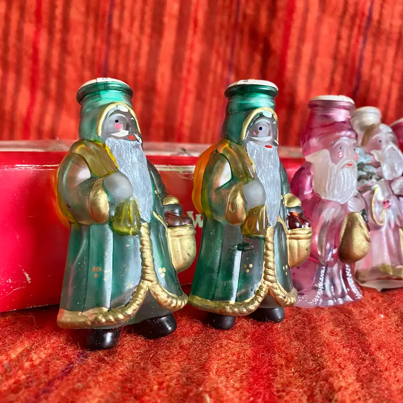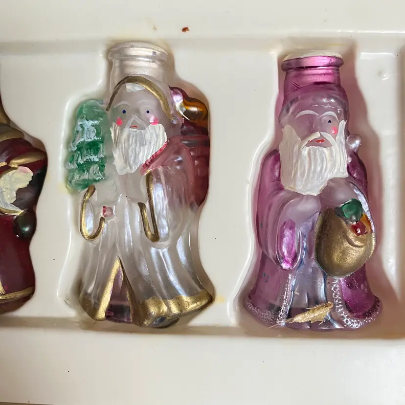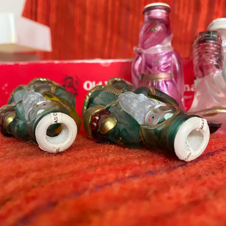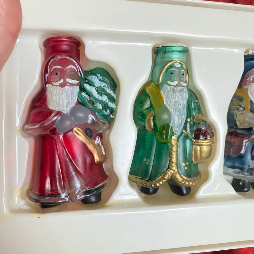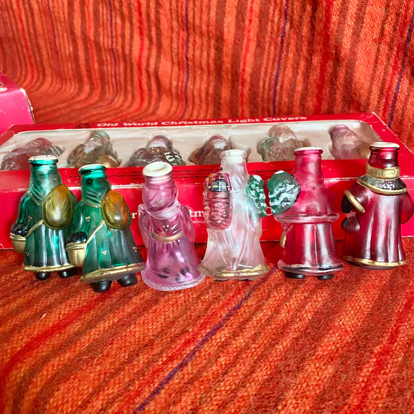 Two sets of six vintage Old World Christmas string light covers made of glass in various Santa shapes and colors in original packaging. Hand painted. The packaging states these are replicas of early 1900s ornaments. Old World Christmas is the brand name and research indicated they were established in 1979. There is a blue painted santa in one box, at some point this piece was replaced with another green one in the second box. In total there are four red, three green, two clear, one blue and two purple. They have a rubber lined hole at the top that will fit snugly around standard sized string lights. The rubber is not stiff from age and should function as intended. No broken pieces. There are minor instances of paint wear. The boxes have wear and tear including punctures in the cellophane and also a strip of packing tape on each. Made in Taiwan. Each light cover measures about 3.25" tall.