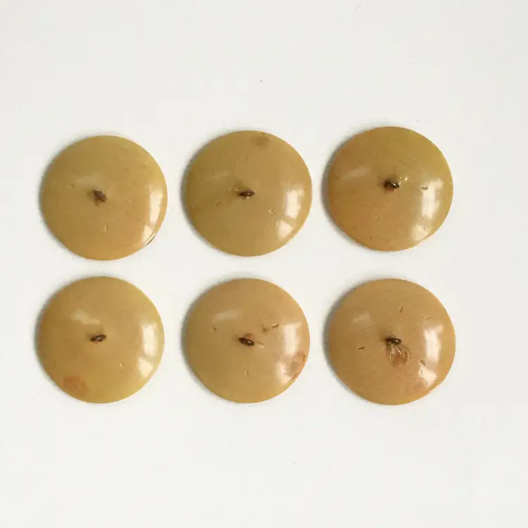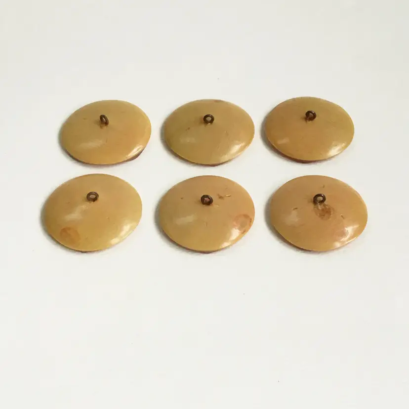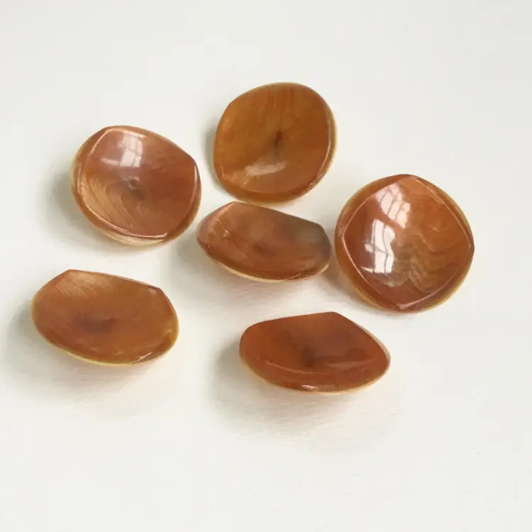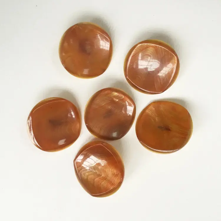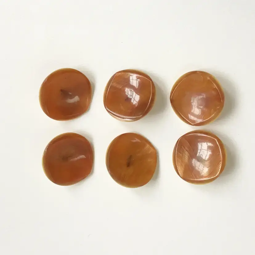 This is a set of six coat buttons. They feature a semi translucent rounded square top with an orange swirl pattern. Slight shimmer throughout the material. The backing is an opaque celluloid with a shank.