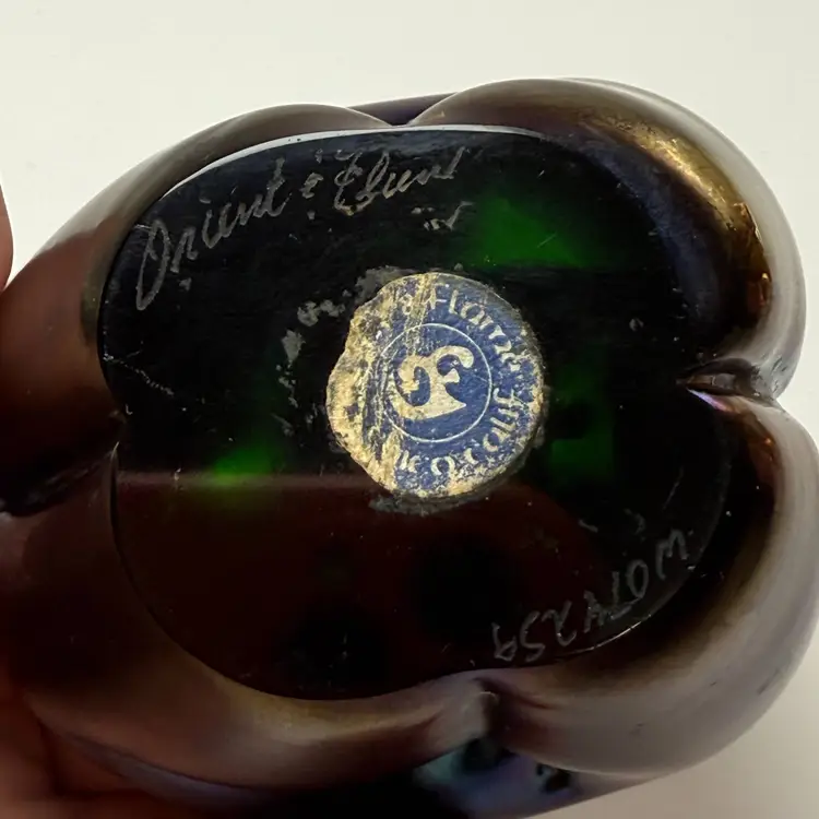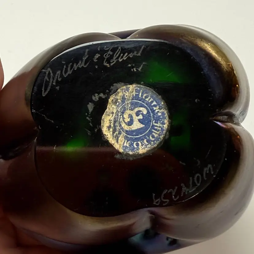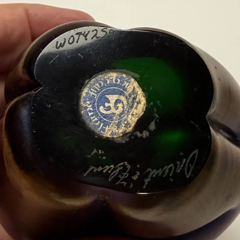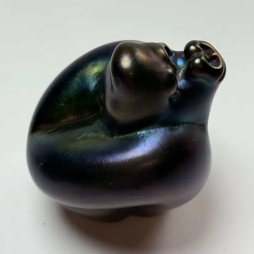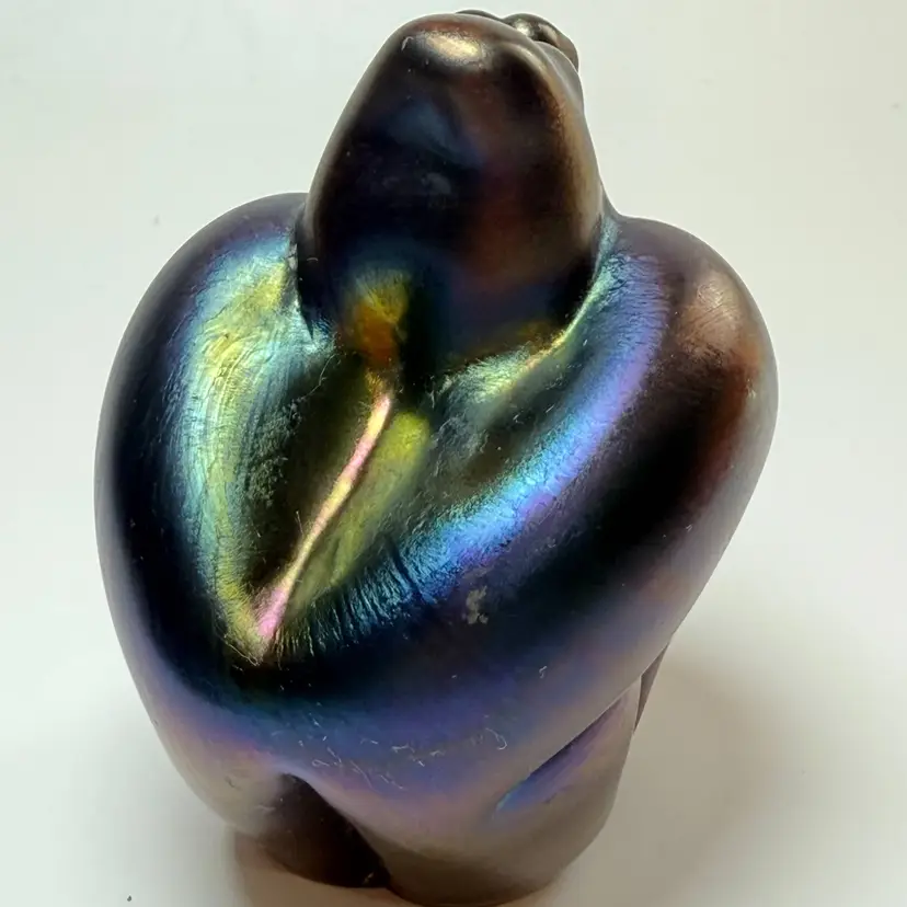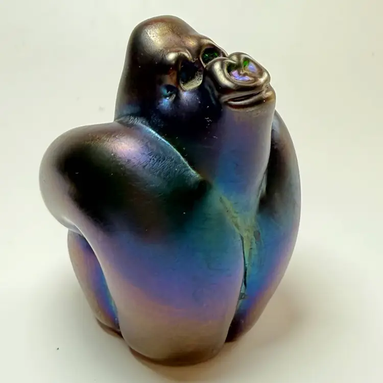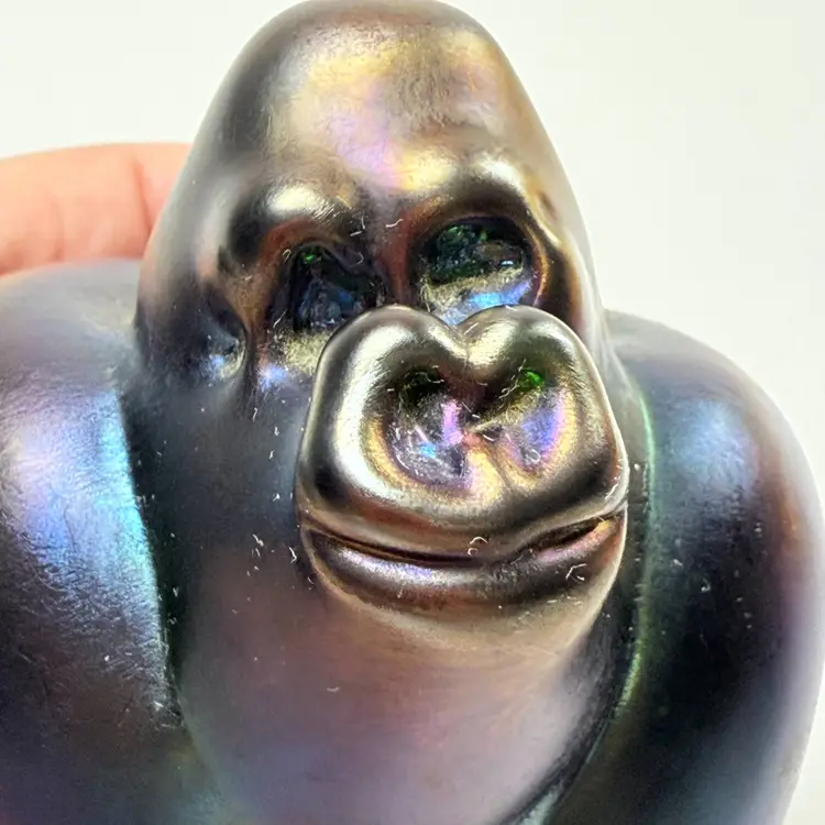About 4" tall. No chips, no cracks and no bruising. Base color is green. Wonderful Silver Back Gorilla art glass figure with deep green, blue and purple hues with metallic luster finish. Signed on base and numbered W074259 with partial blue and white original label. This studio glass piece was produced in California and dates to the 1980s or so.