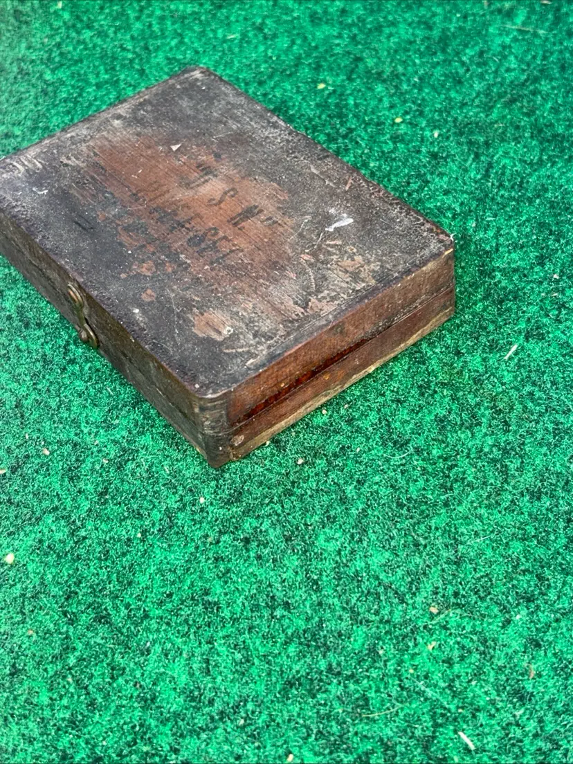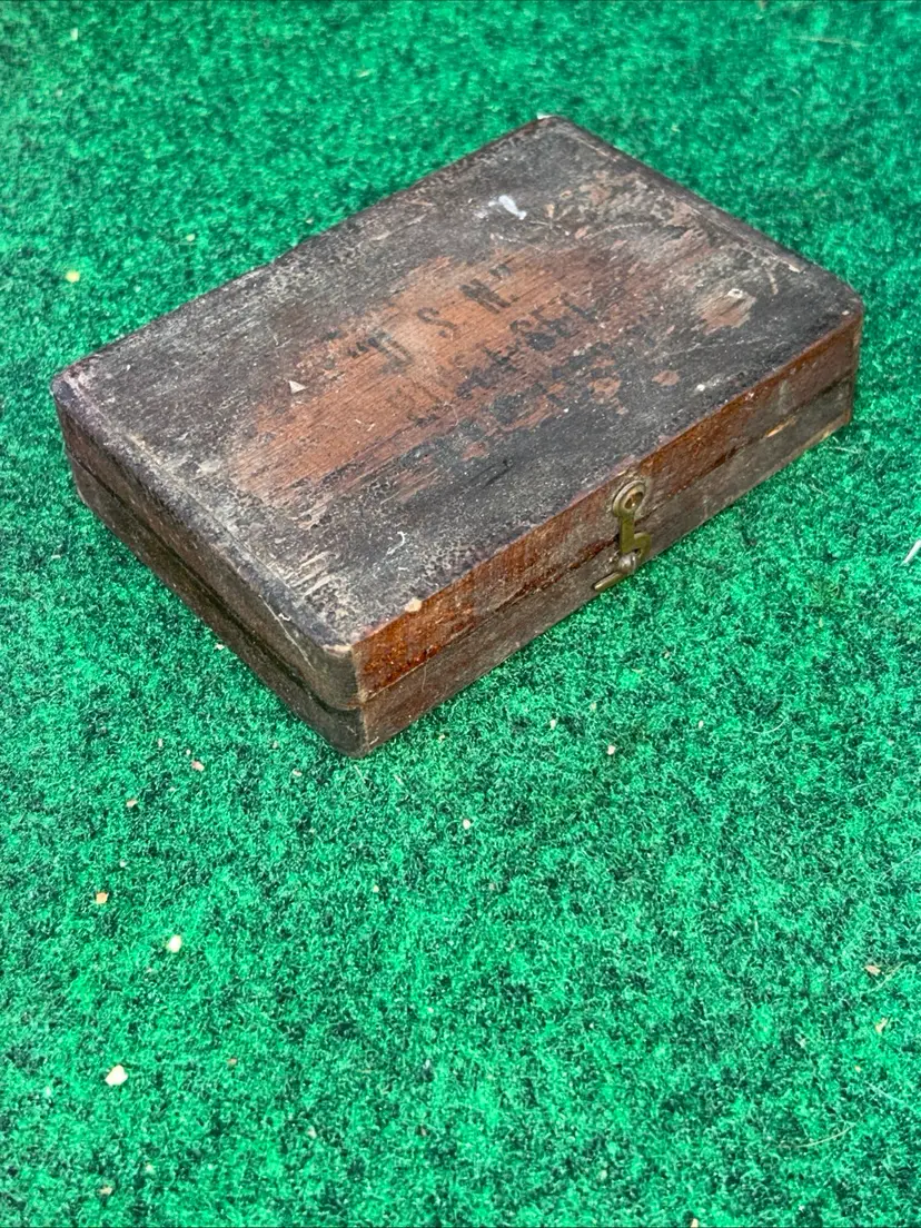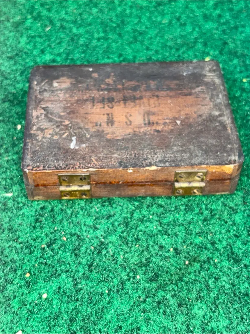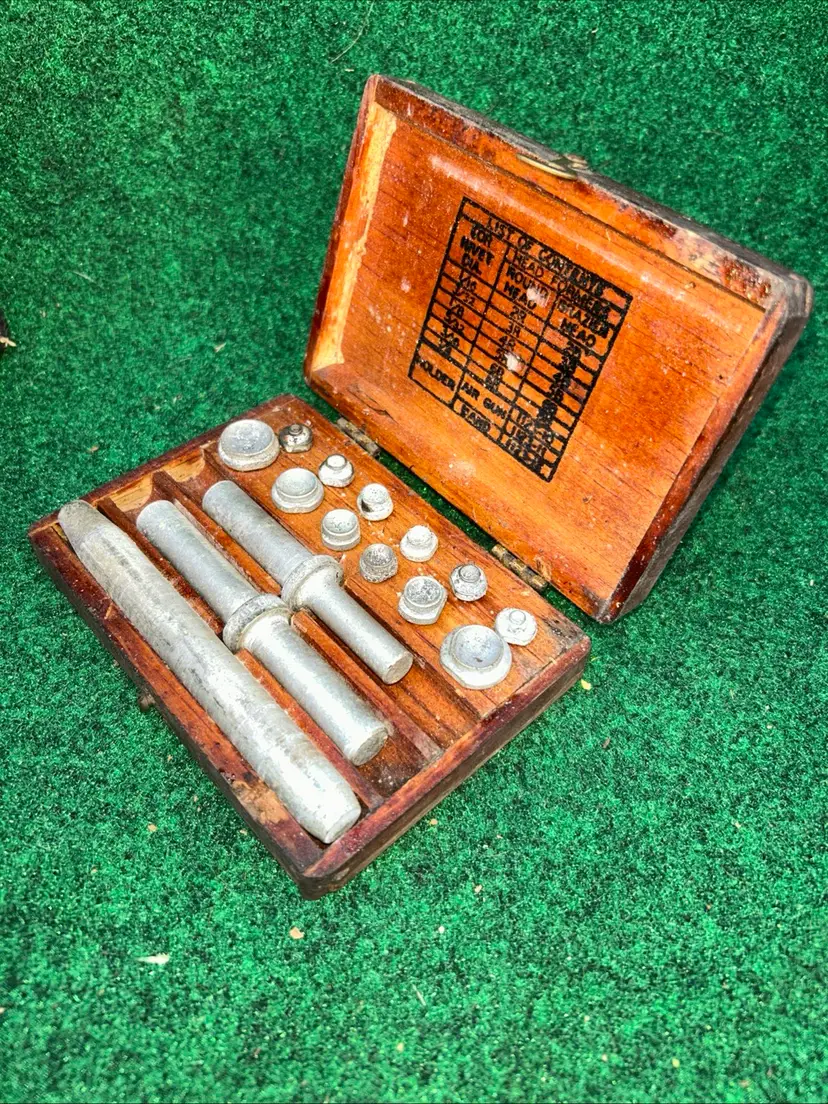 The product is a vintage original WW II era U.S. Navy USN rivet set housed in a wooden case. This collectible item is a piece of militaria history from the United States, specifically representing the period of World War II. The rivet set is an original period item, adding to its historical value and authenticity. Perfect for collectors of military memorabilia and enthusiasts of World War II history, this item offers a unique glimpse into the equipment used during that significant era.
