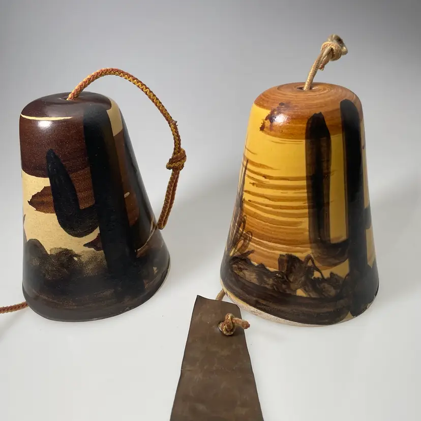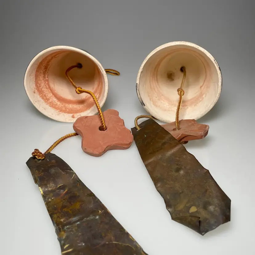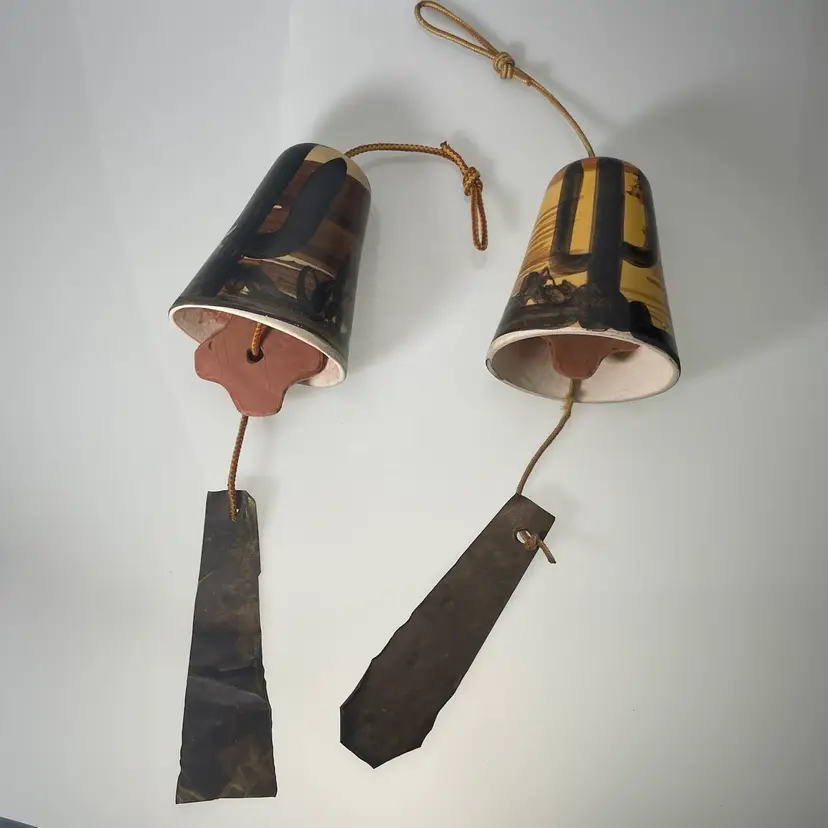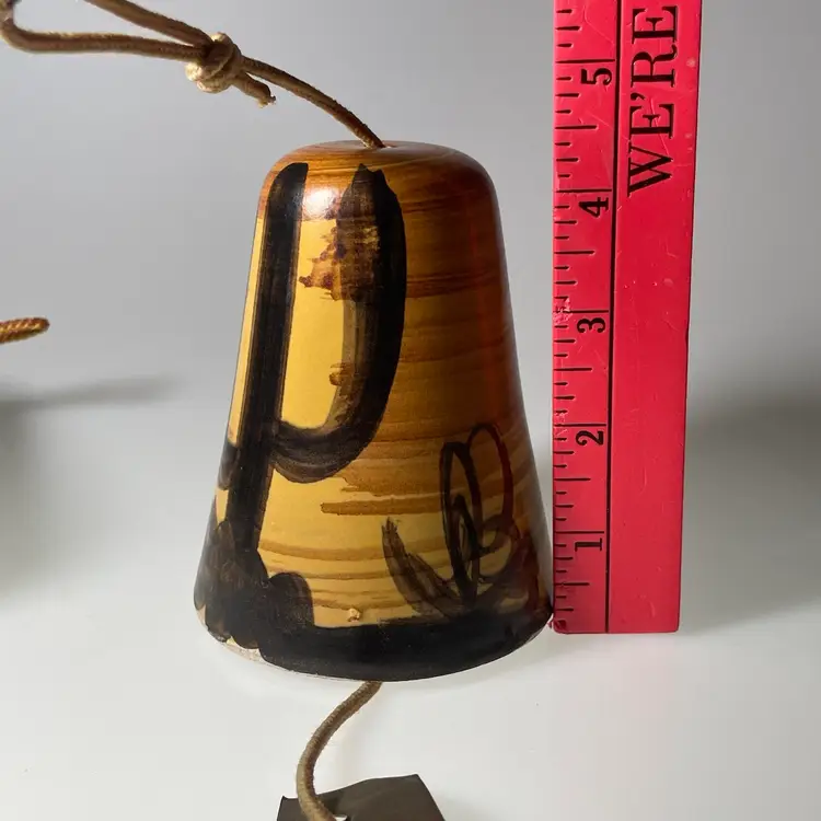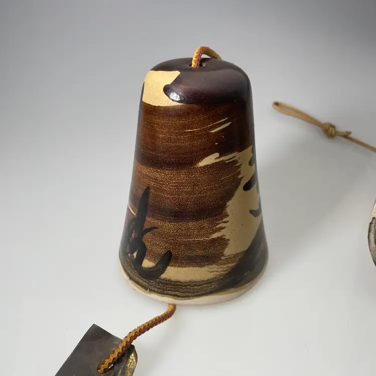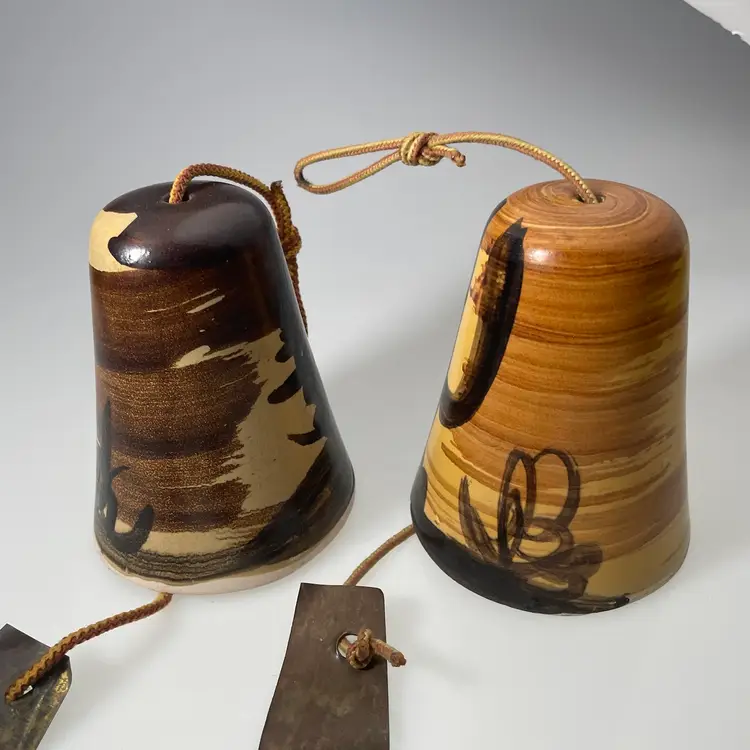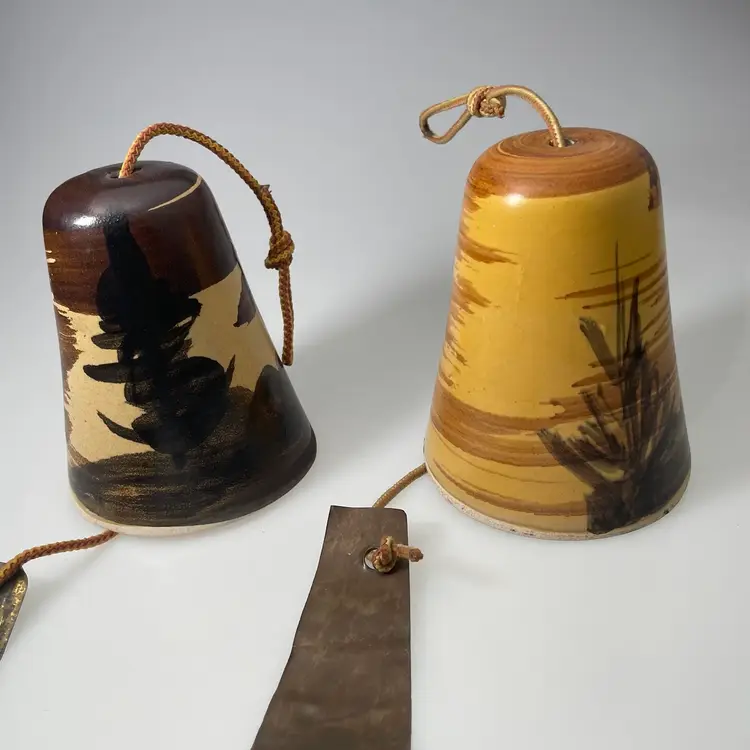 Good Preowned - visible wear and/or minor flaws present. One of the terracotta pendulums is chipped, but does not affect function. Brass pendants show wear & patina. One cord shows fraying, pictured. Pottery bells themselves in great shape.