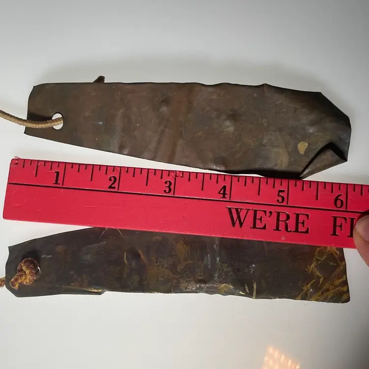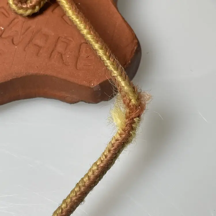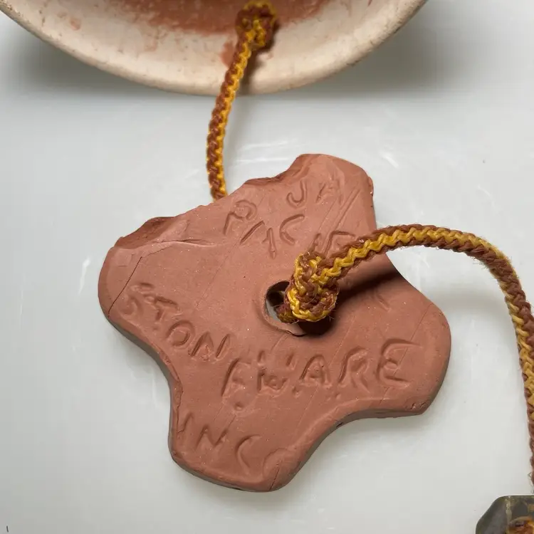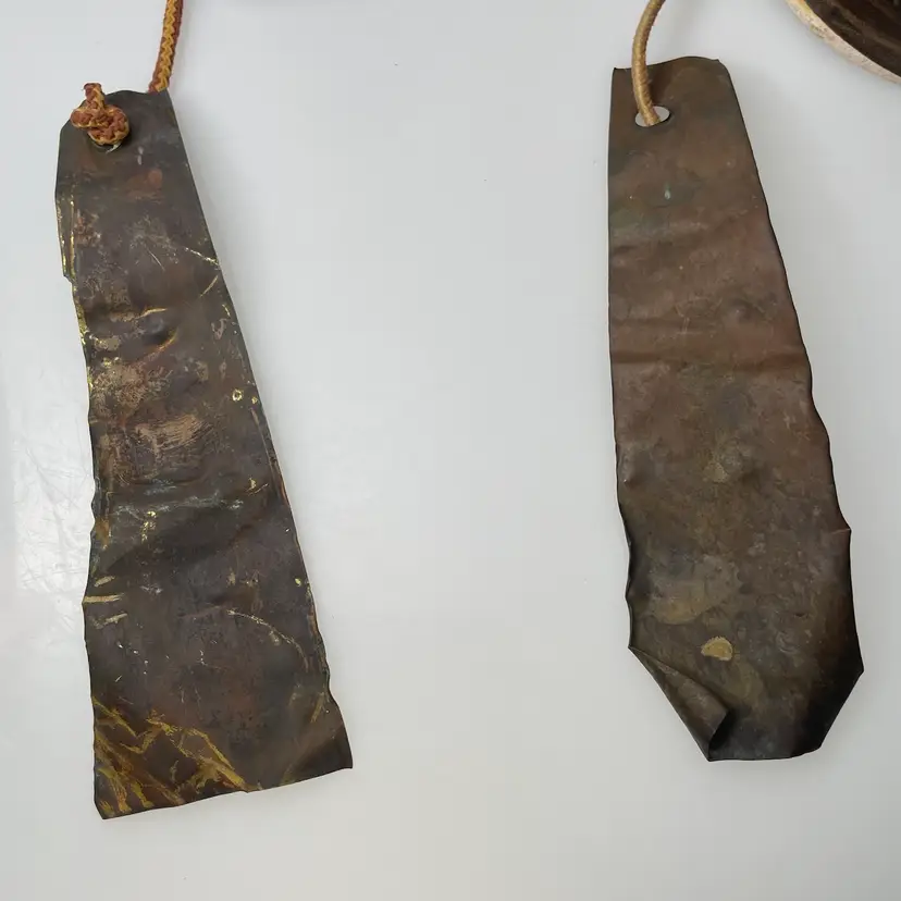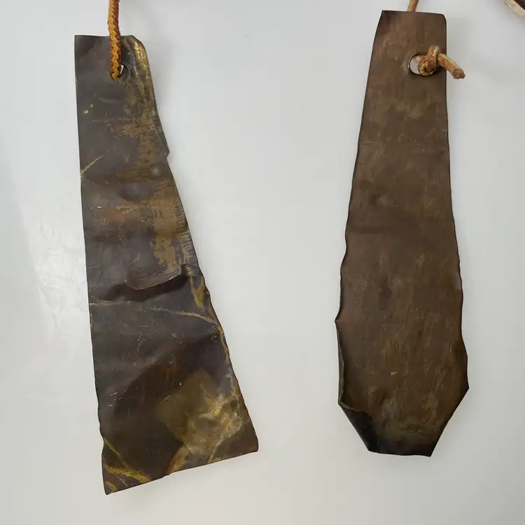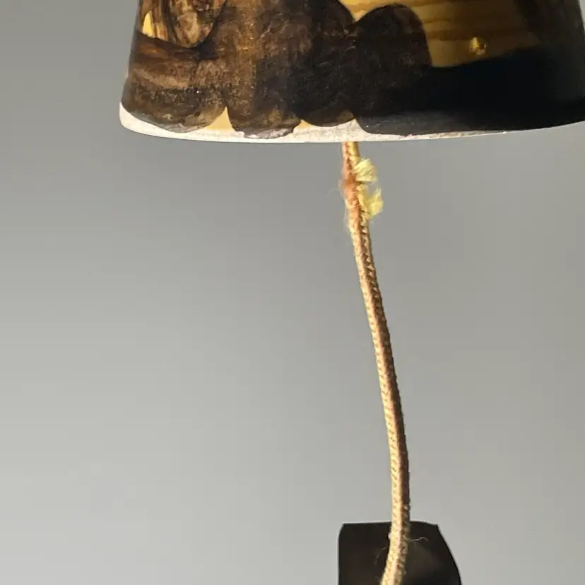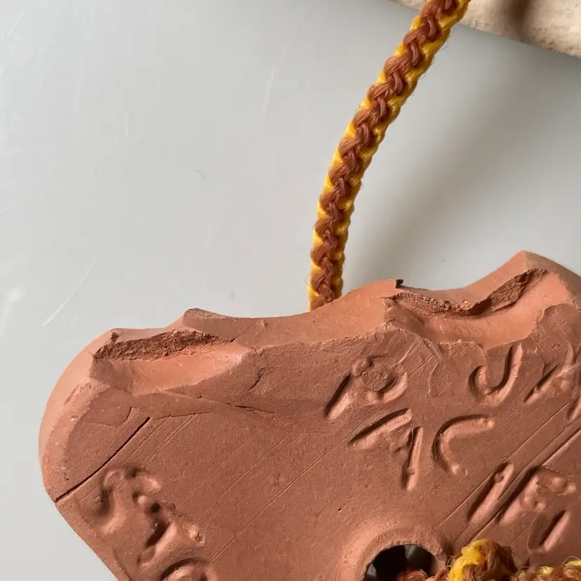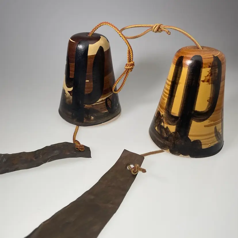 Good Preowned - visible wear and/or minor flaws present. One of the terracotta pendulums is chipped, but does not affect function. Brass pendants show wear & patina. One cord shows fraying, pictured. Pottery bells themselves in great shape.