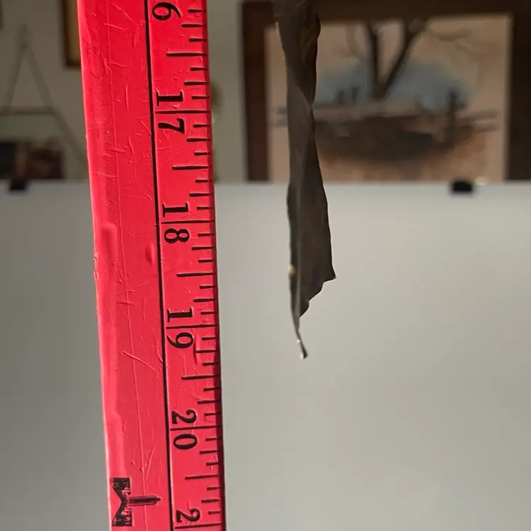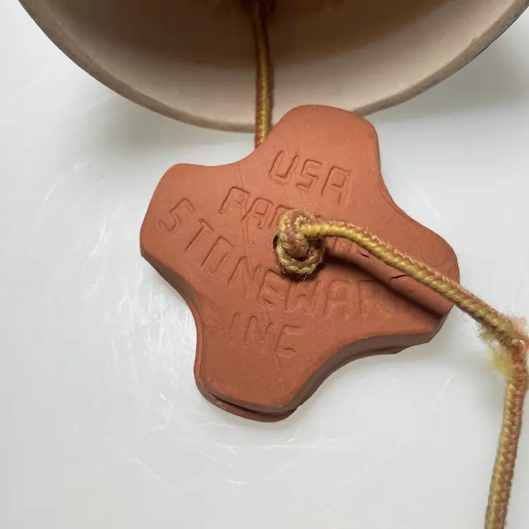 Measurements are approximate: pottery bell is 4.25 inches tall, length from hanging loop to bottom of piece about 19 inches