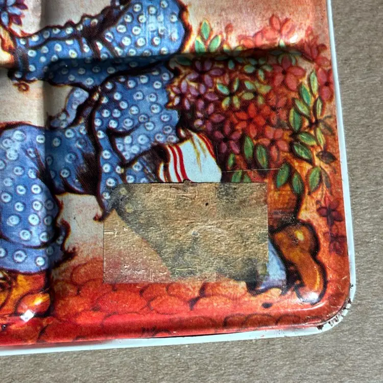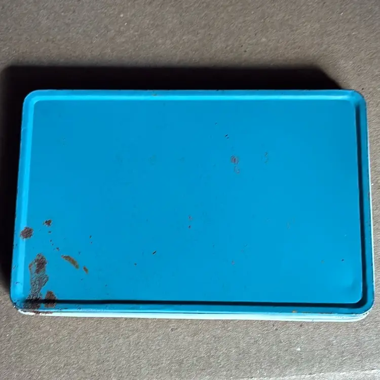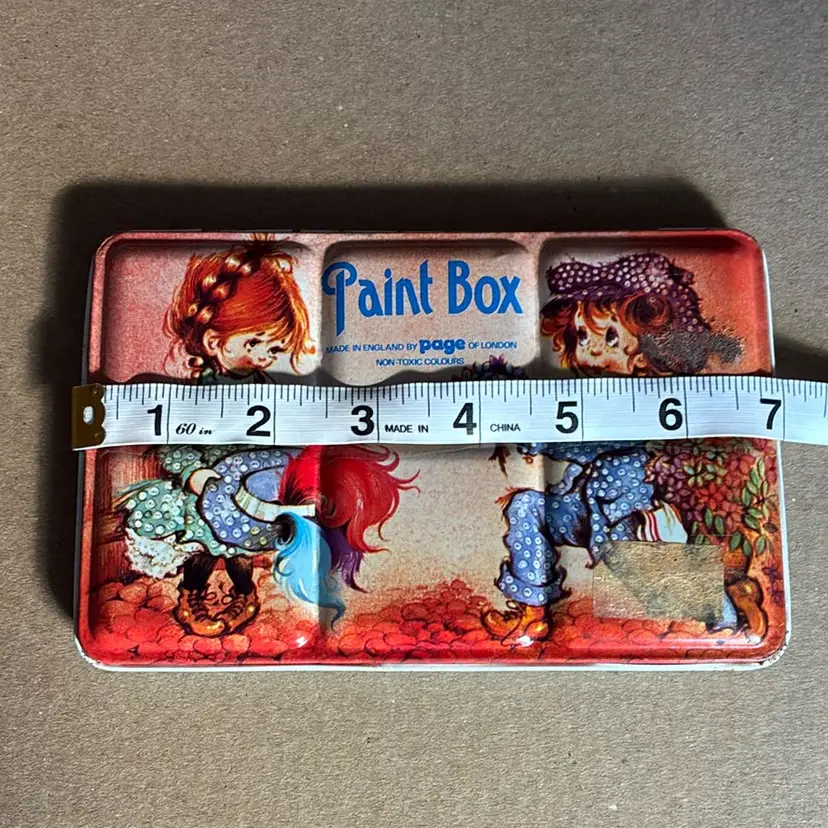 This vintage 1950s paint box is adorable! Some wear on the edges of the tin and back. Paint is used, but that adds to the charm! Made in London.