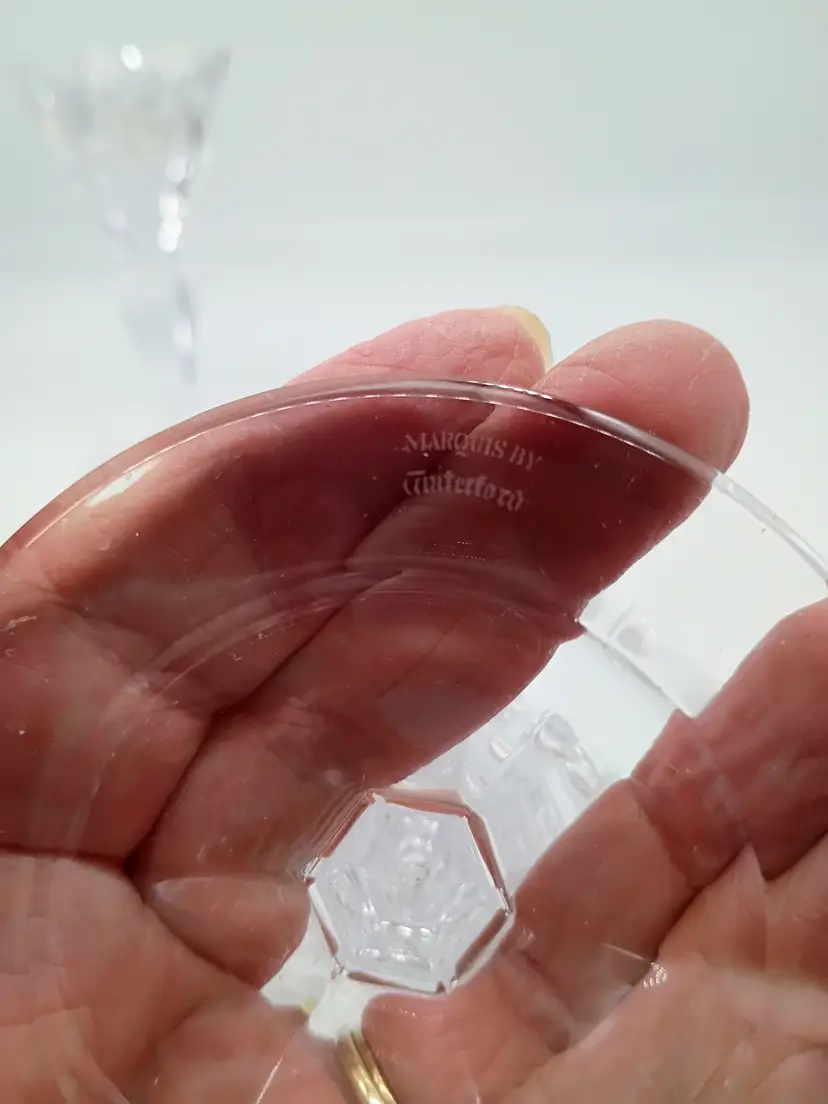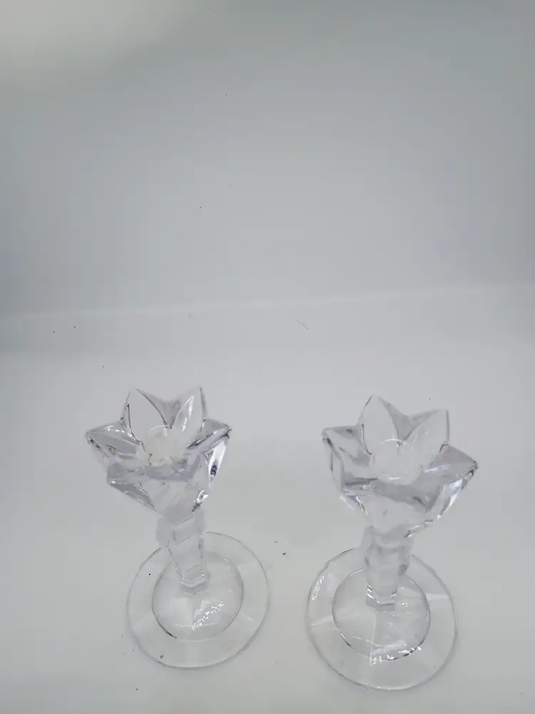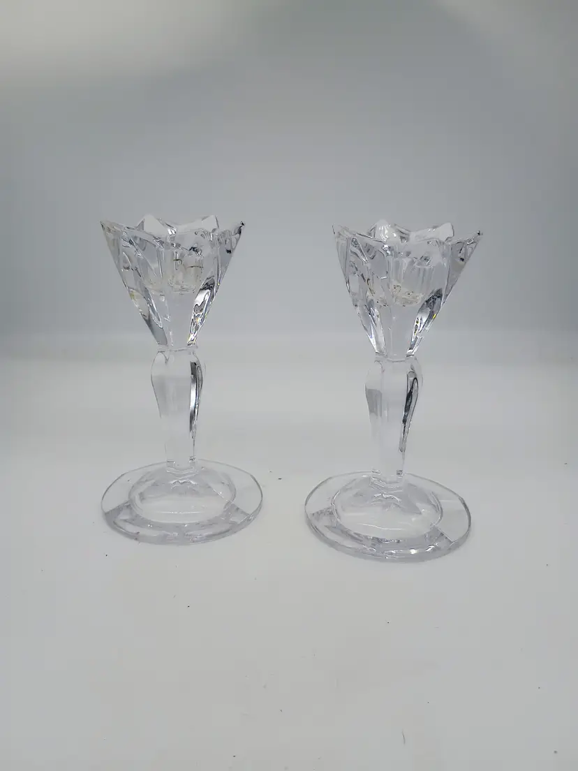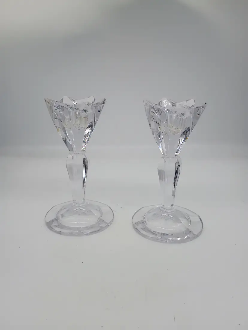 Vintage Pair of Marquis by Waterford Tulip Shaped Flora Pattern Candlesticks 6 inches tall and 3.5 inch base diameter. Circa 1990's No Chips or Cracks No Flea Bites. These are marked with the etched Waterford mark. NO BOX. They are free of wax and soot residue in Excellent like new condition. Will Ship USPS domestically and UPS worldwide