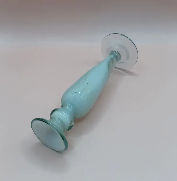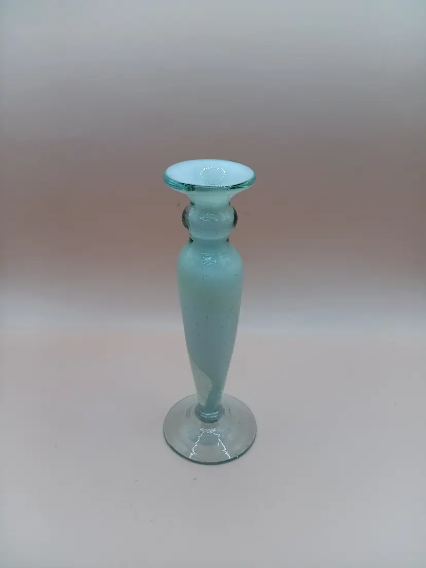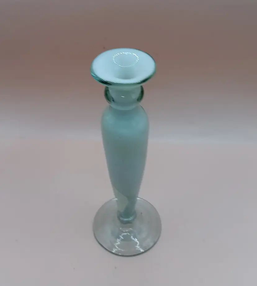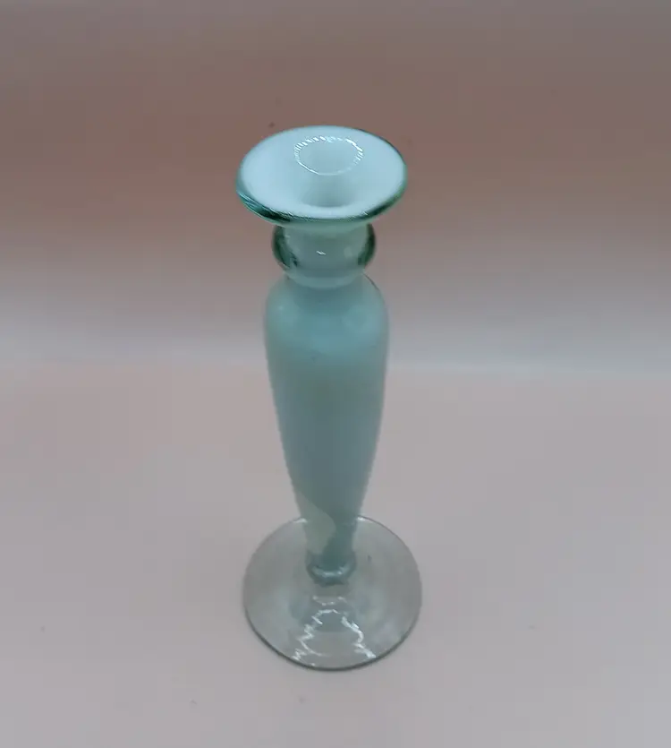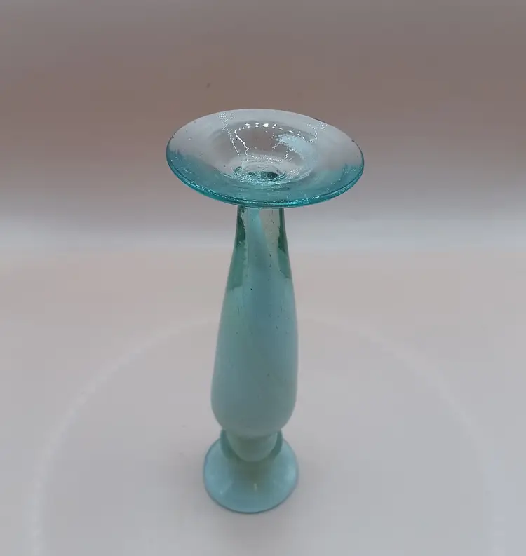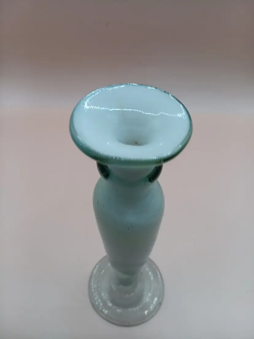 This vintage pale mint green and white cased single bud vase stands at 6 inches tall, making it a small and elegant addition to any decor. With a glossy finish and Mid-Century Modernism style, this original glass vase is a charming piece for collectors of decorative items. Its pastel color and classic design make it a versatile and timeless piece that can complement a variety of interior styles.