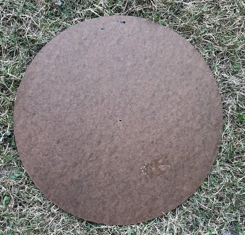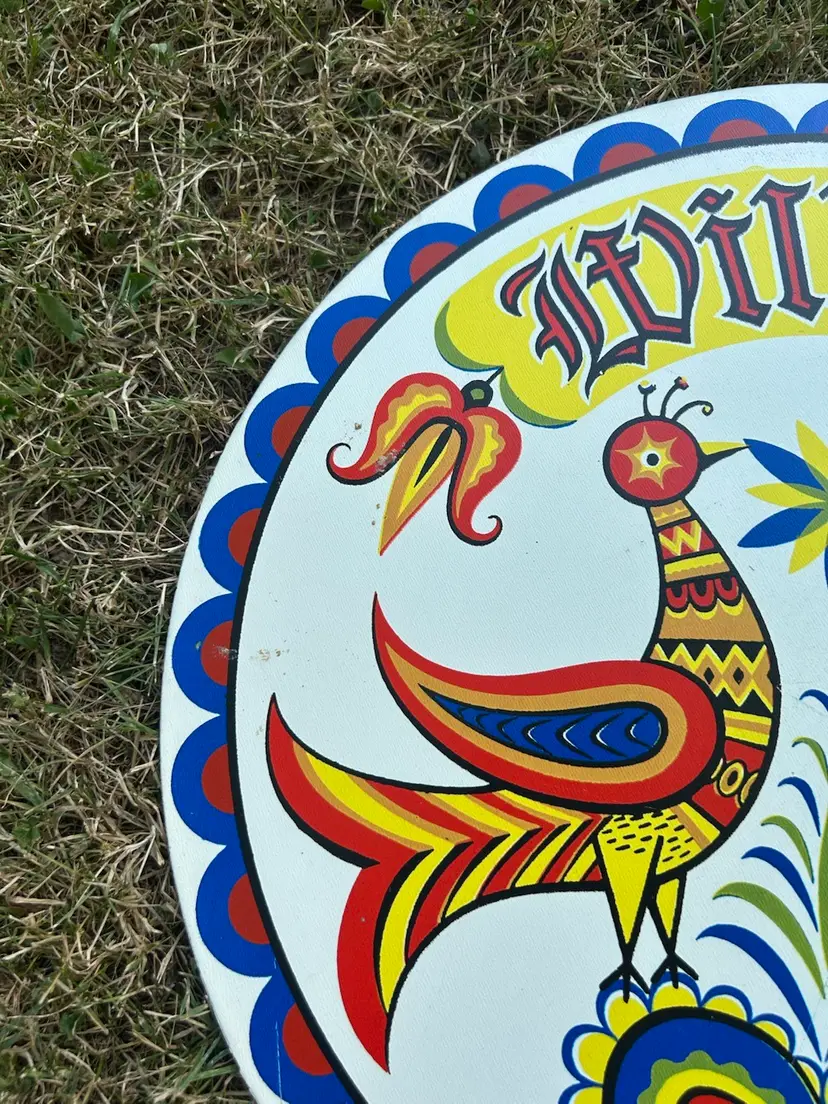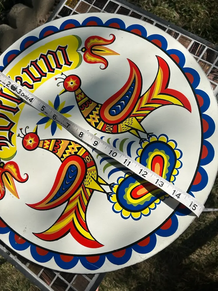 Graphic overall still very bright, has light wear mostly around edges. Has some stuff stuck to the one side but withdrawals delicate cleaning looks like it will come off easy. Back has some residue.
