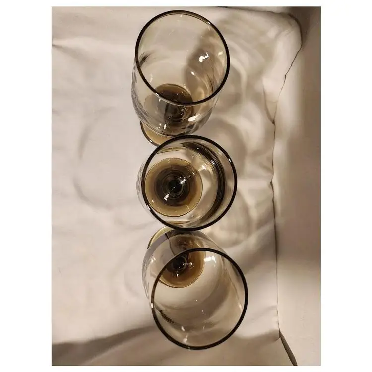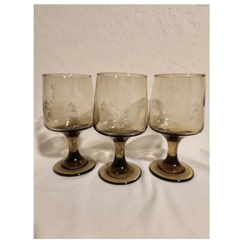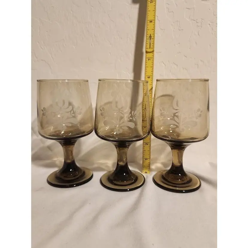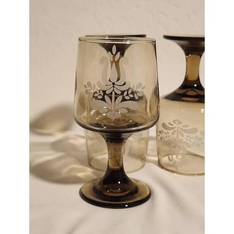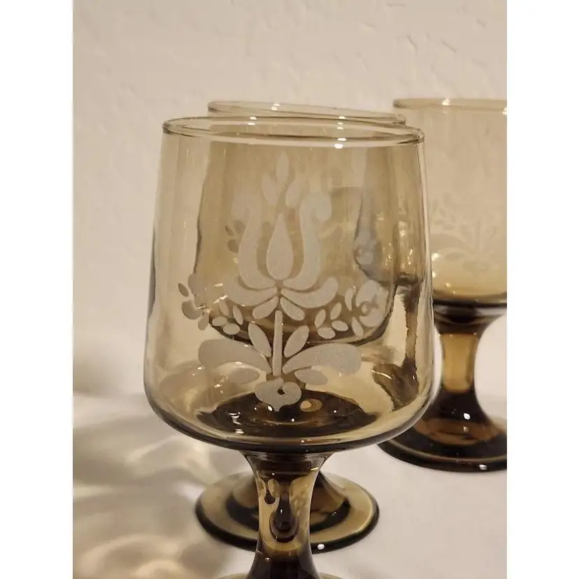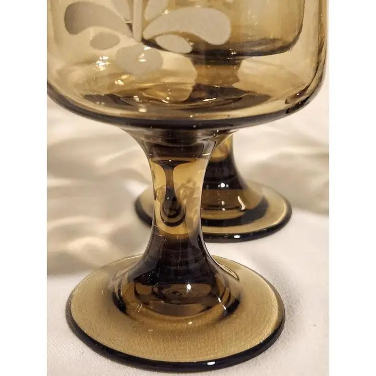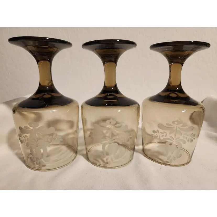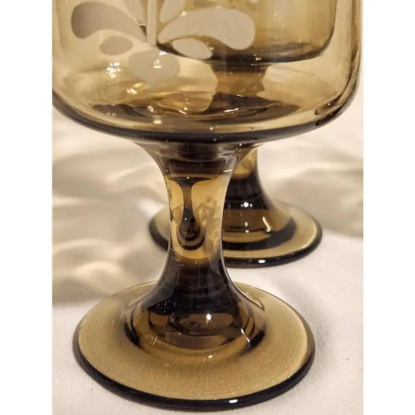 Elevate your dining experience with this set of vintage etched amber wine glasses. Perfect for adding a touch of elegance to any occasion, these glasses feature a delicate floral design. A must-have for vintage glassware collectors!