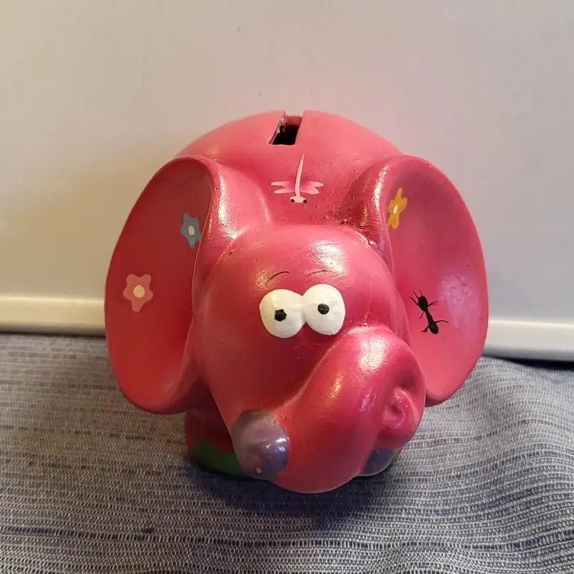 Adorable pink elephant coin bank with colorful flower and ant details. Perfect for adding a touch of whimsy to your vintage collection.
