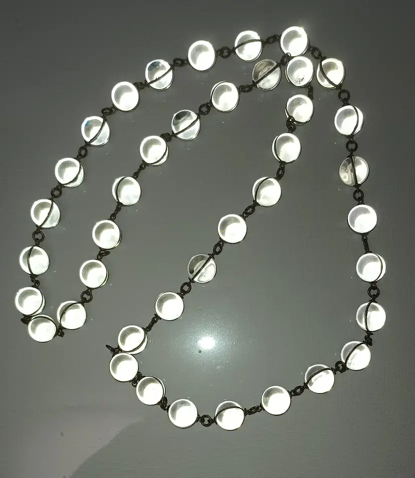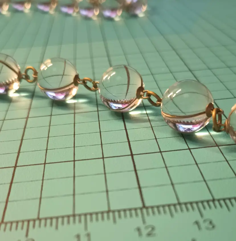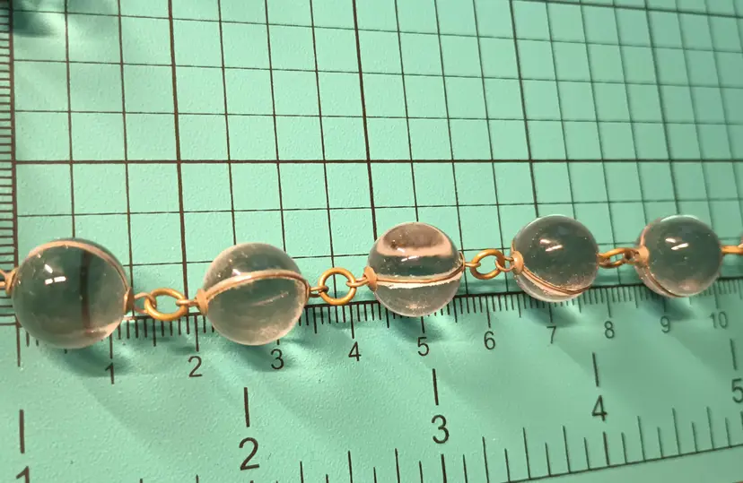 Unfortunately I need to sell my Gorgeous “Pools of light” necklace with 40 beautiful crystal orbs wrapped in a gold tone wire. The wire may be gold I haven't checked. You can wear these with any color they are amazing! I always get compliments when wearing them.