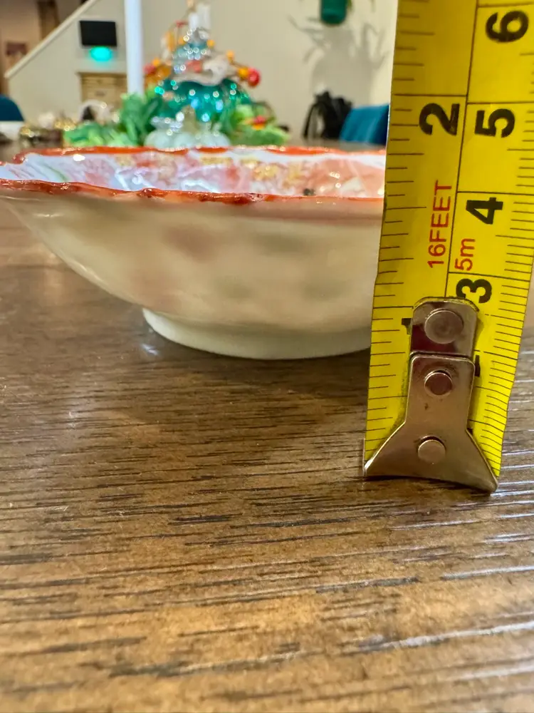 The bowl has a scalloped edge with a red or orange rim