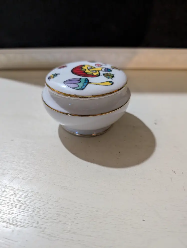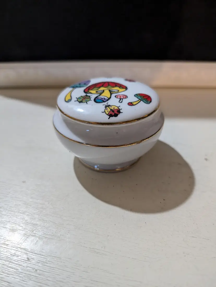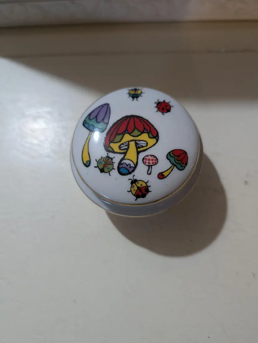 Adorable vintage trinket box featuring a whimsical mushroom and ladybug design. This piece is used but in excellent condition with no cracks or chips. The colorful artwork on the lid adds a playful touch, making it a charming addition to any collection. Perfect for storing small treasures or as a decorative piece. The box measures approximately 3.5 inches in diameter and 2.5 inch in height. A delightful find for any vintage lover!