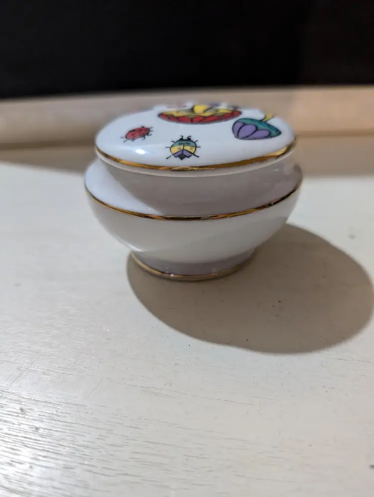 Vintage Porcelain Transfer Design Mushroom and Ladybug Trinket Box