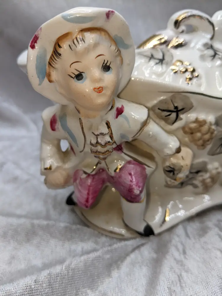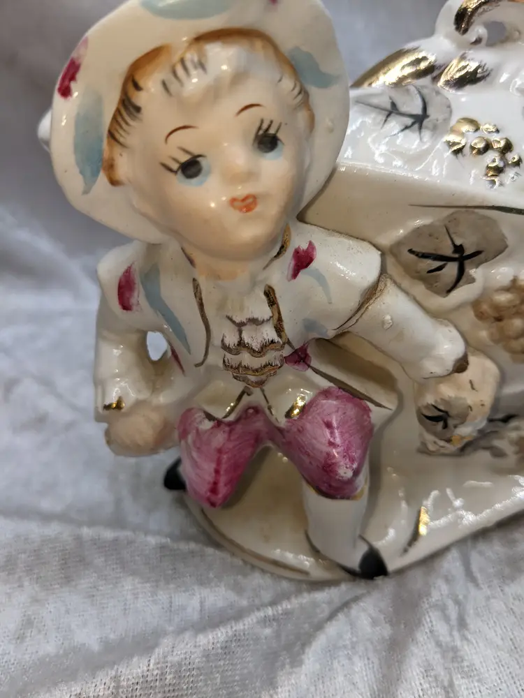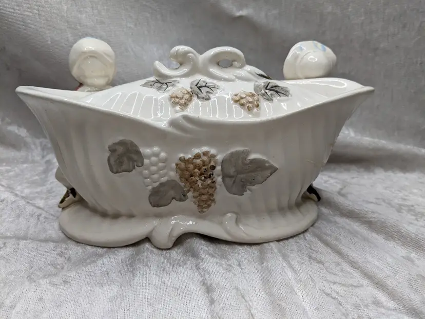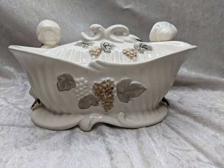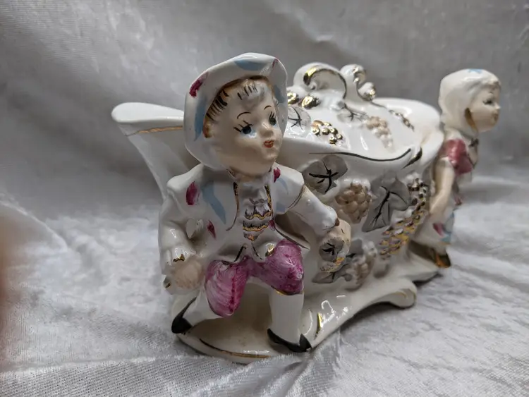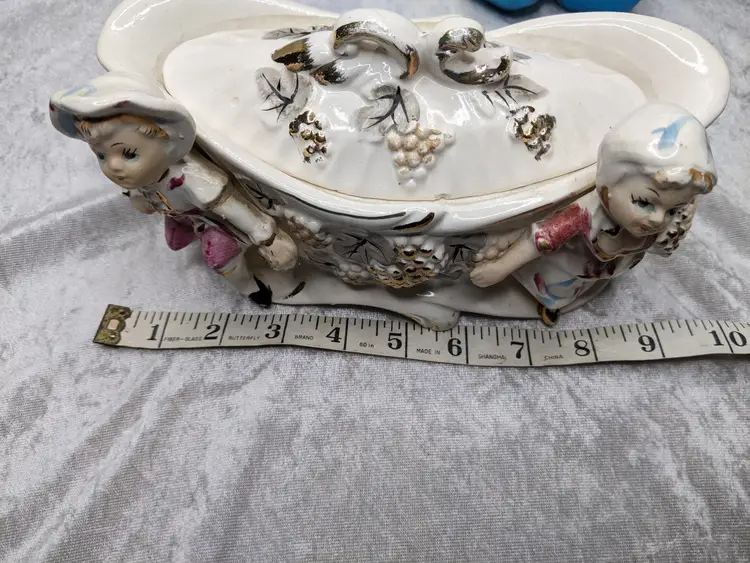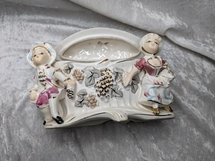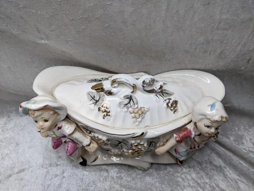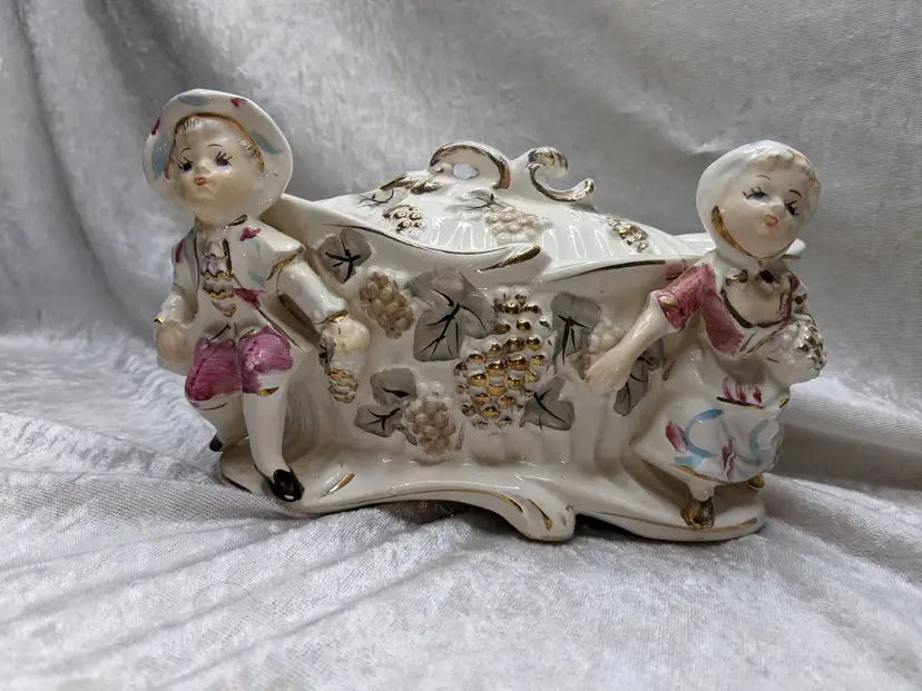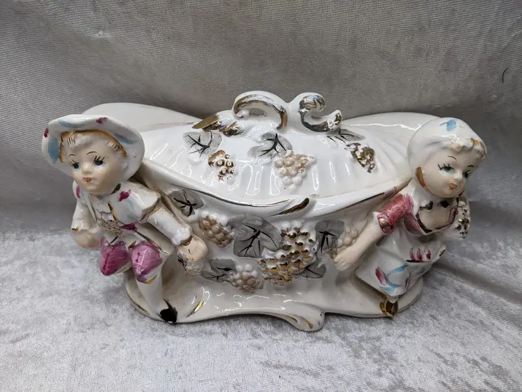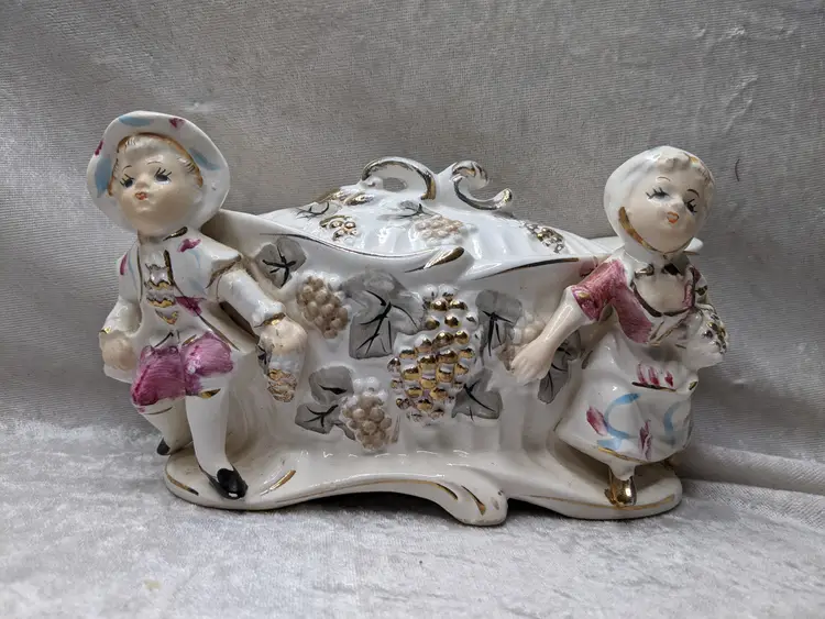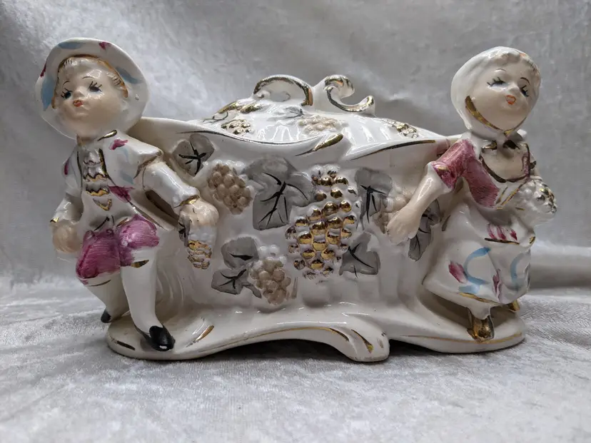 Vintage Porcelain Trinket Jar Box Victorian Girl Boy Figurine Pair Marked Japan Grapes Covered Porcelain Trinket Jar Box Victorian Girl Boy Figurine Pair with gold laced grapes and green leaves. it measures 8.5in long and 5.5 in tall. Nice fancy stash container. Marked Japan Very good condition Clean with there is a small on the front edge of the cover There are no other chips or cracks. no weird smells. Please check the photos for details. Comes from a smoke free home. We do have pets.