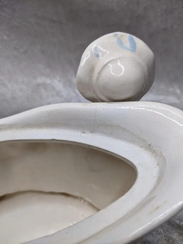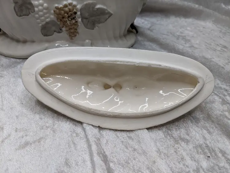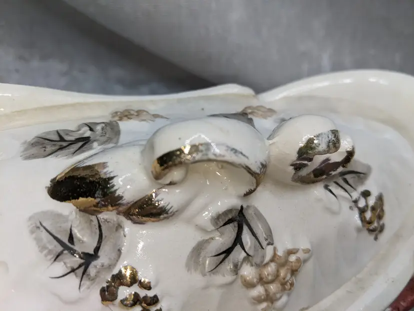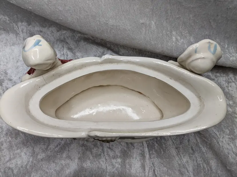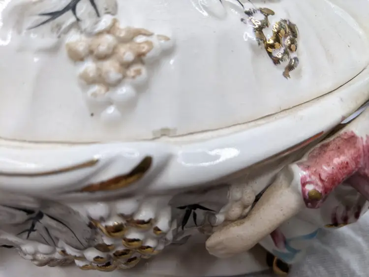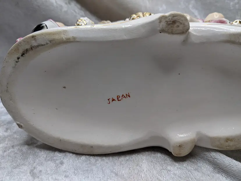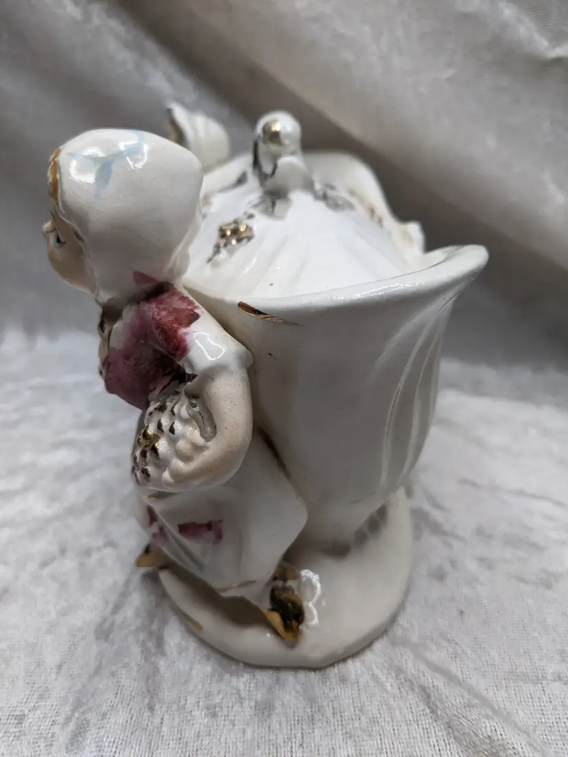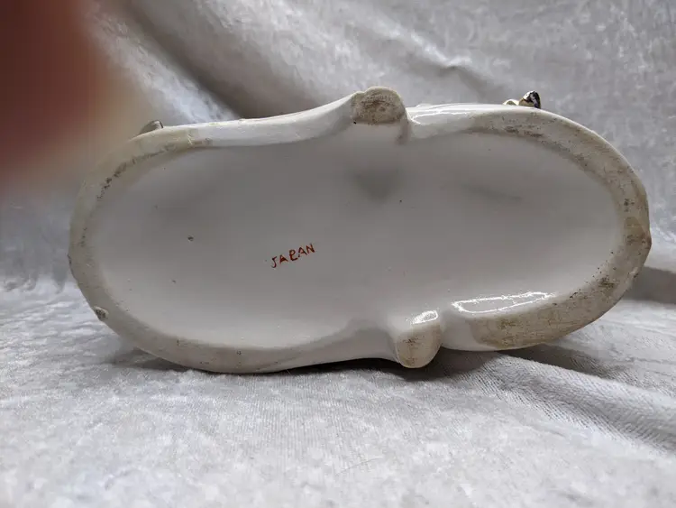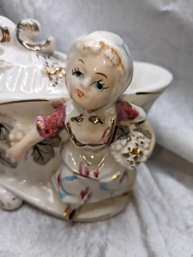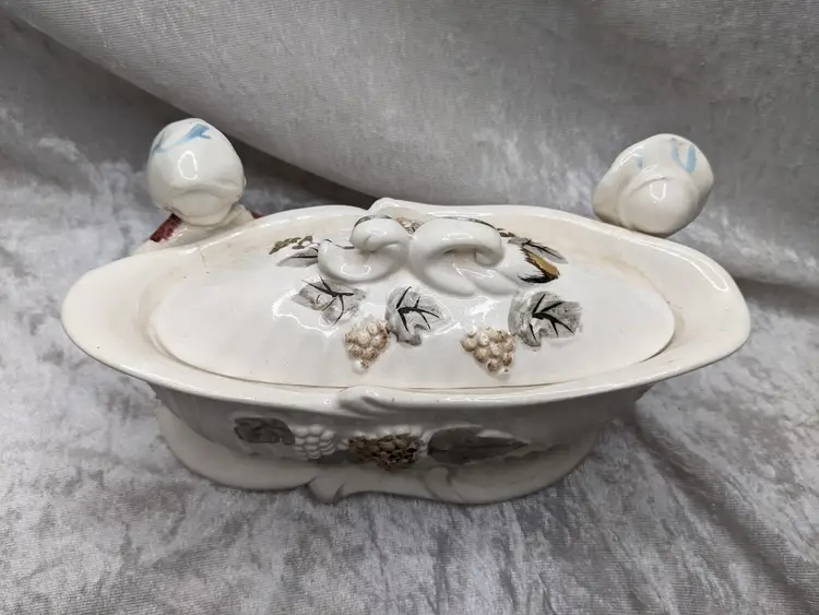 Vintage Porcelain Trinket Jar Box Victorian Girl Boy Figurine Pair Marked Japan Grapes Covered Porcelain Trinket Jar Box Victorian Girl Boy Figurine Pair with gold laced grapes and green leaves. it measures 8.5in long and 5.5 in tall. Nice fancy stash container. Marked Japan Very good condition Clean with there is a small on the front edge of the cover There are no other chips or cracks. no weird smells. Please check the photos for details. Comes from a smoke free home. We do have pets.