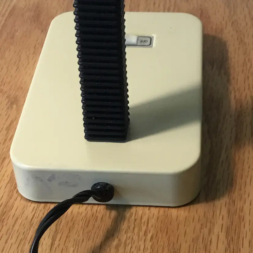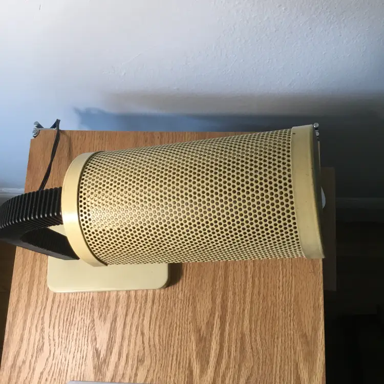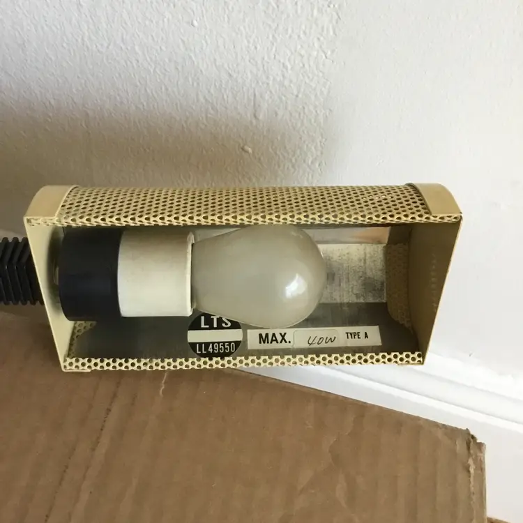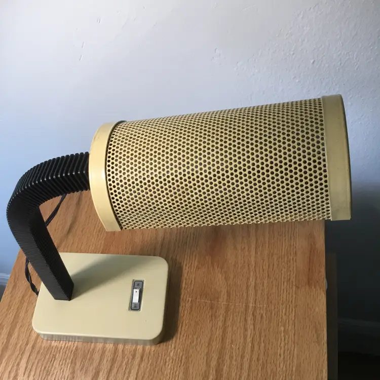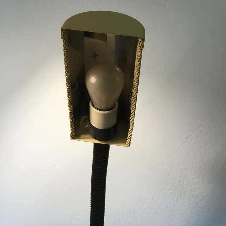 Features a black flexible gooseneck and a metal cream lampshade with cutouts. Lamp has been tested and works. The light bulb is not included.