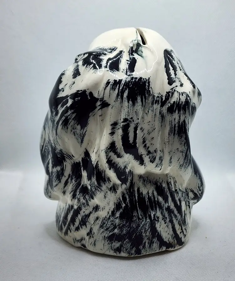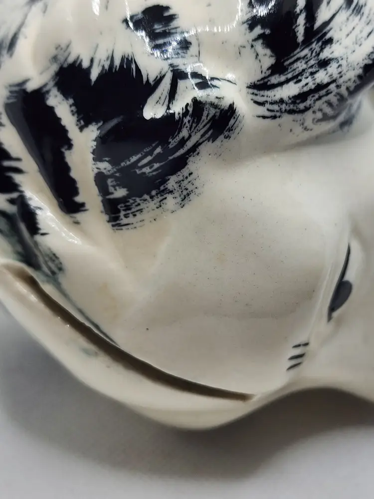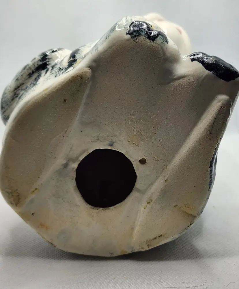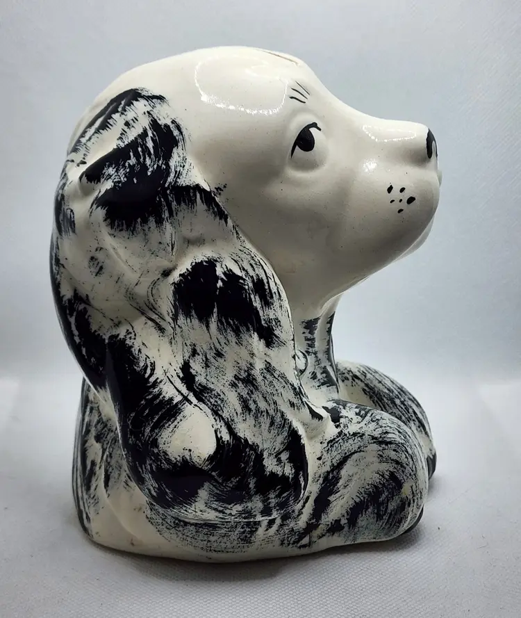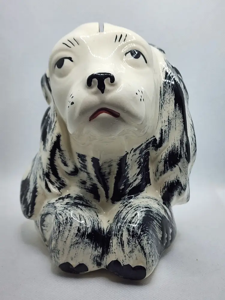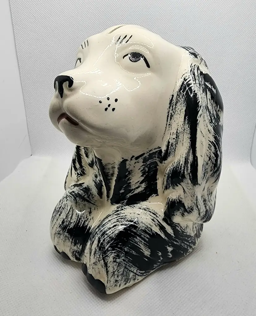 Likely American Bisque, possibly Royal Copley, circa 1940's, white & black Cocker Spaniel dog bank.