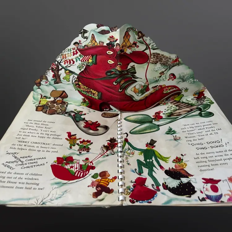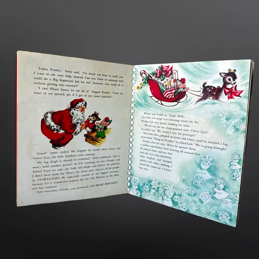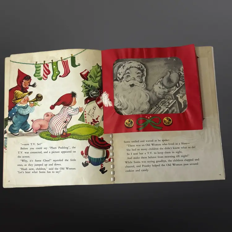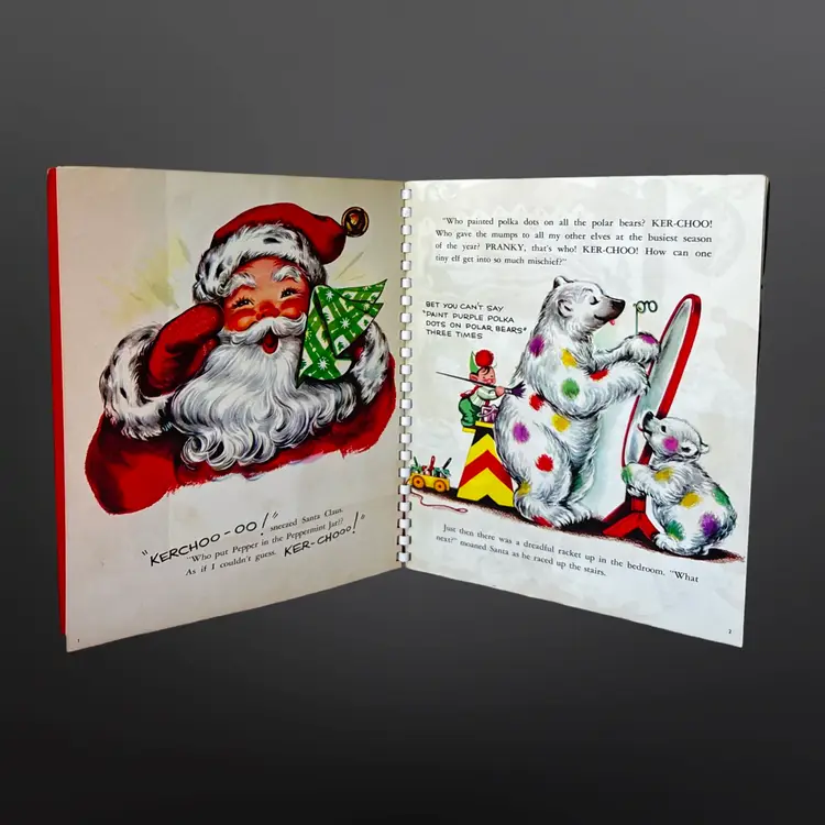Adorable 1950s children’s pop-up book- Pranky’s Christmas. Featuring darling illustrations by Charlot Byi. In overall good condition with a few condition issues; missing the clock on the cover and one side of the candy jar on the first page disconnected, but otherwise in very good condition for its age.