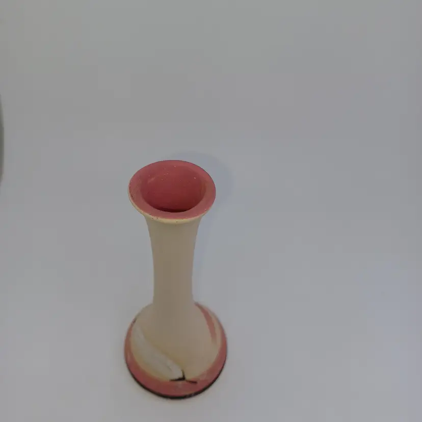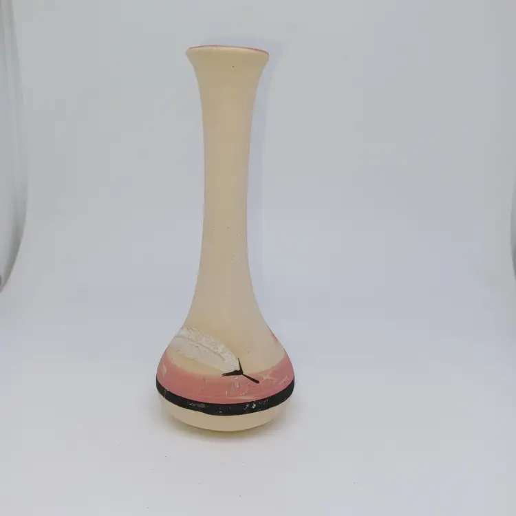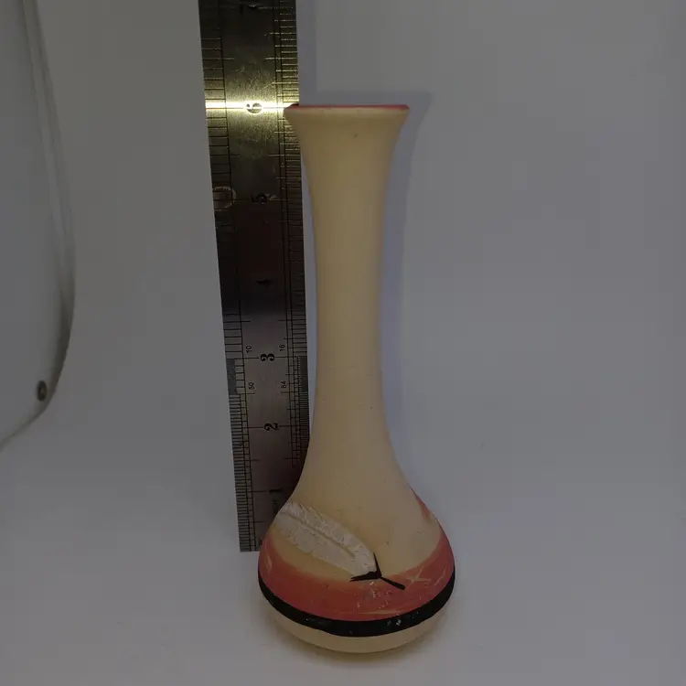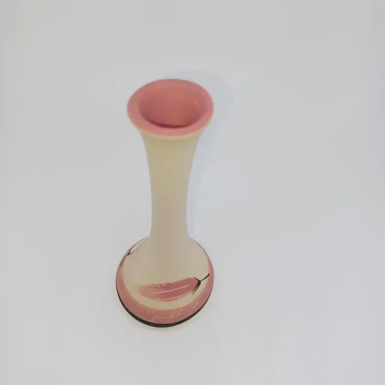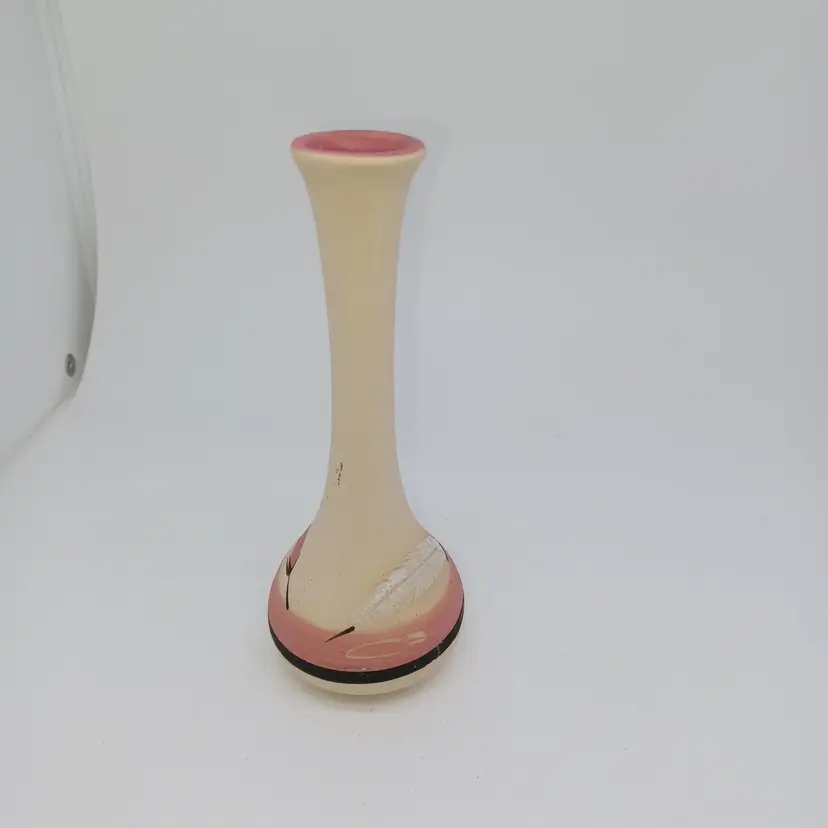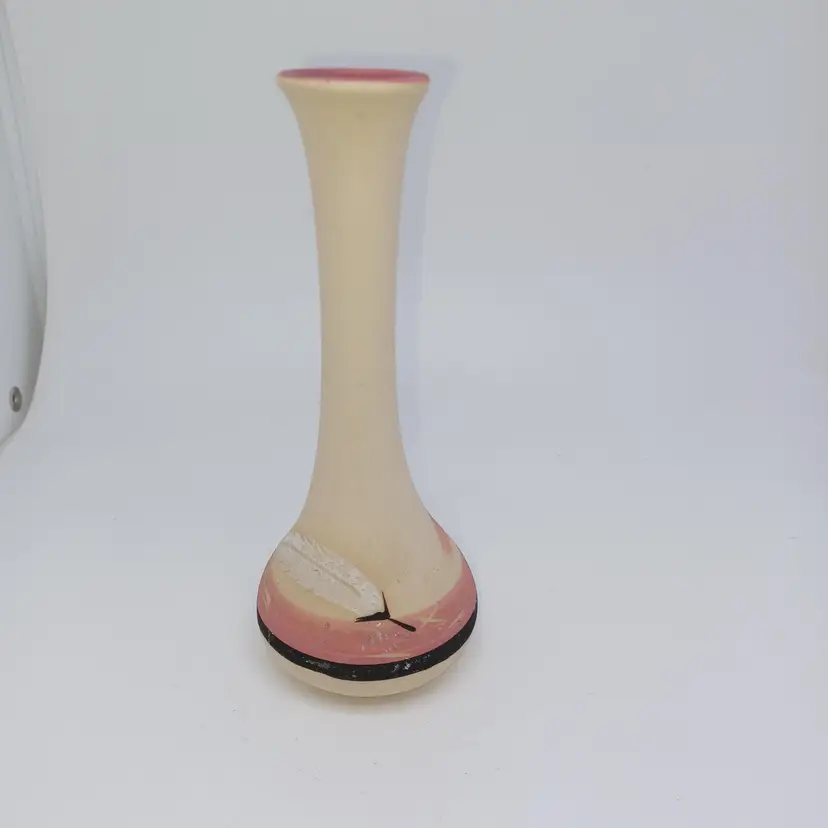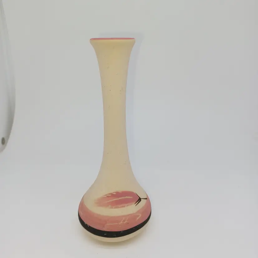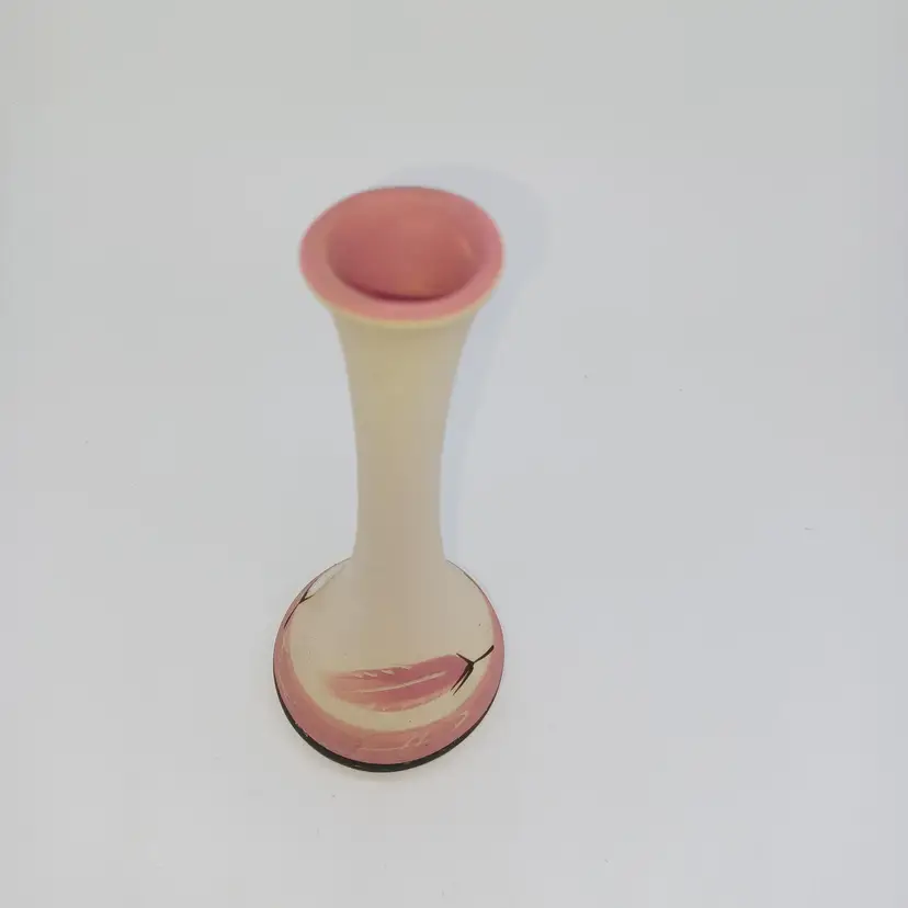 Vintage pink and cream hand-painted feather 6-in Bud vase Pueblo Pottery Marked Rose feather 98 on the bottom In good vintage condition with no chips or cracks does have a paint splotch that I did try to picture does not detract from use or display please see pictures as they are the best description all items from a smoke-free home with pets experienced fragile shipper