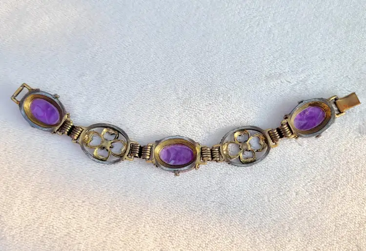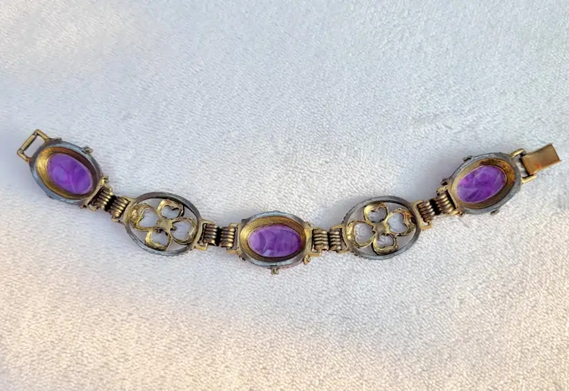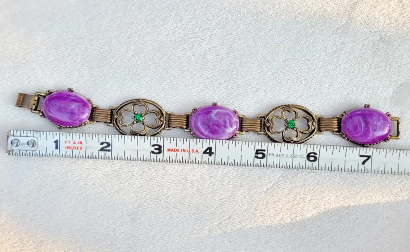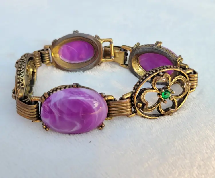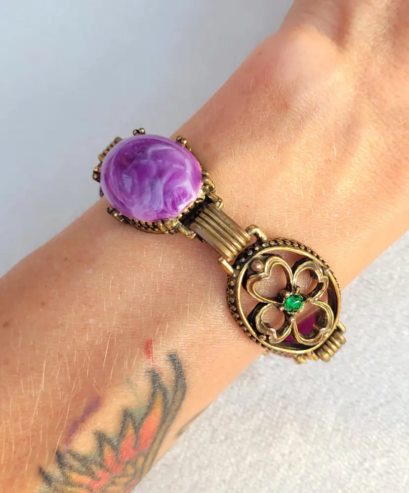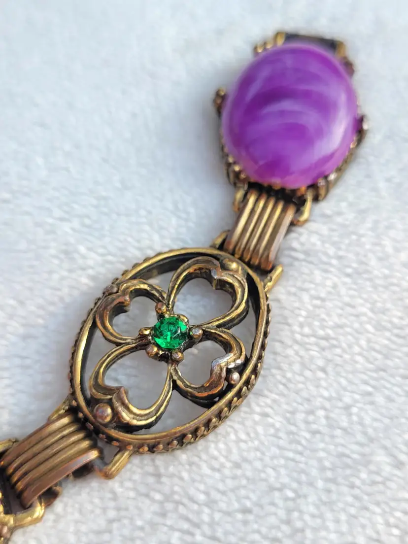 Gorgeous chunky statement bracelet from an estate, with swirling purple cabachons and emerald-green colored rhinestone accents. This is circa 1940s/50s and is in good condition from an estate. Please see pictures for details and measurements, does not include my display box.