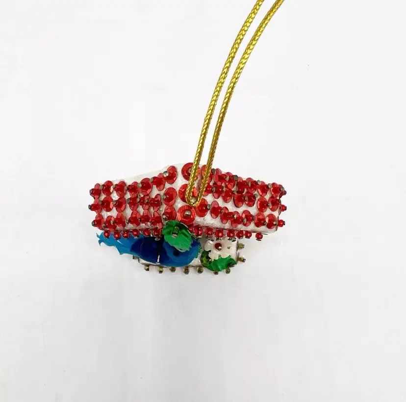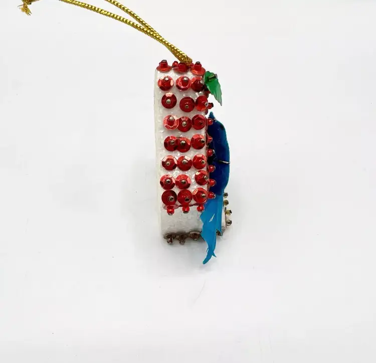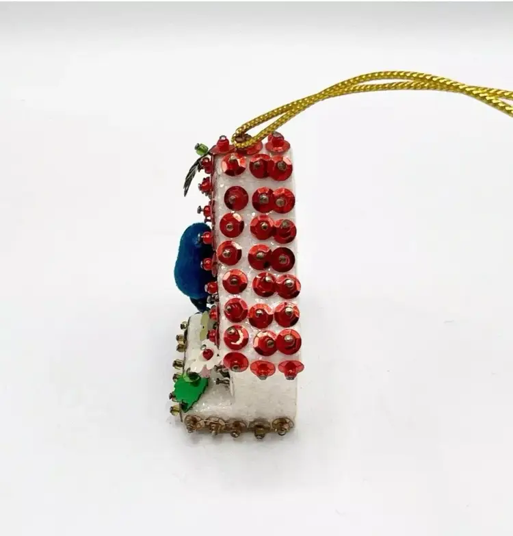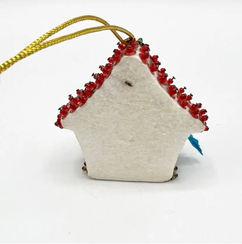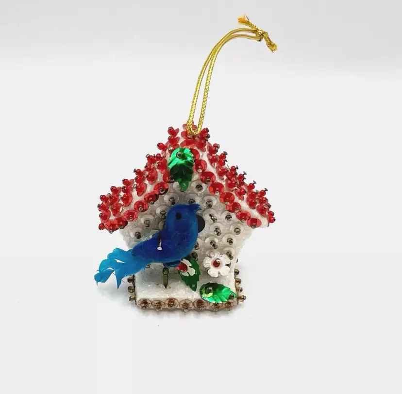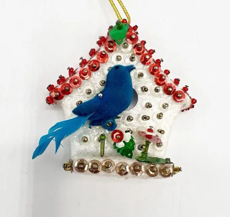 Vintage Christmas Ornament Pushpin Sequin Bird House Bluebird Bird Handmade 2.5"