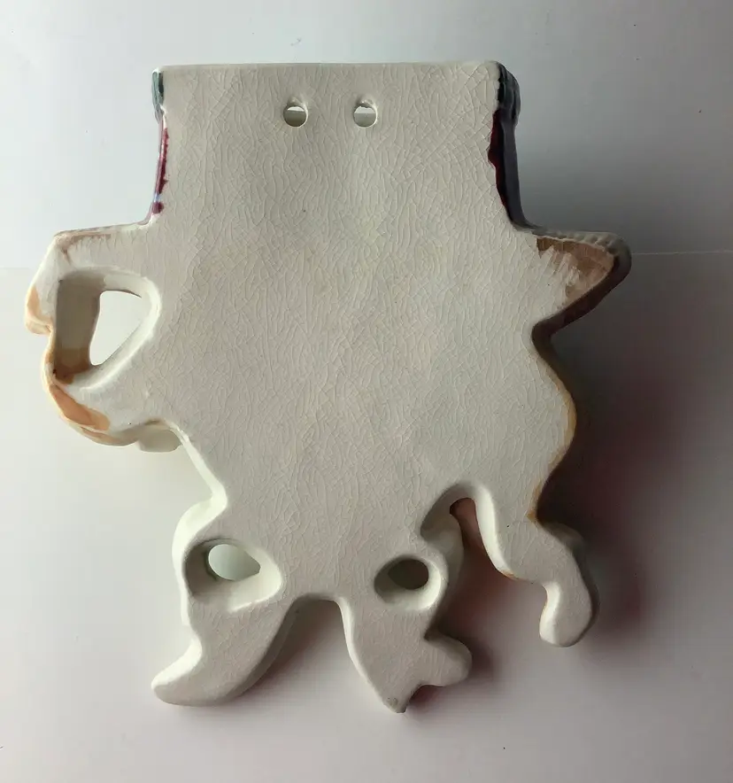 This is a really unique wall pocket. She measures 7 tall and 6.5” wide. Two holes on back for hanging. Some crazing from age, circa 1960s. Not marked. Good pre-owned condition. I appreciate your interest! I Shaina UPS 3 day, and bubble pack securely for safe transit. Thanks!