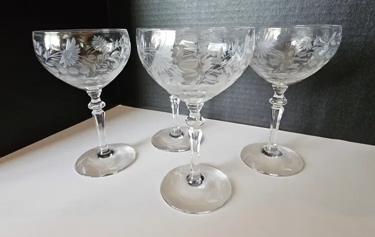 1930's Set of 4. "Anniversary Cut & Etched Floral” pattern. 6" tall. Excellent condition.
