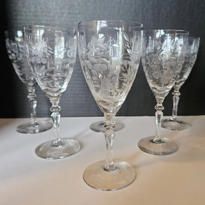 1930's Set of 6 “Anniversary Cut & Etched Floral” 7 3/4" tall. Excellent condition.