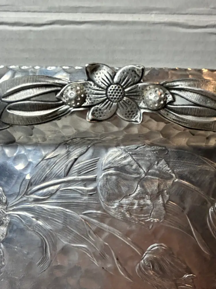 The design features a hammered aluminum finish with a floral pattern of tulips and ribbons.