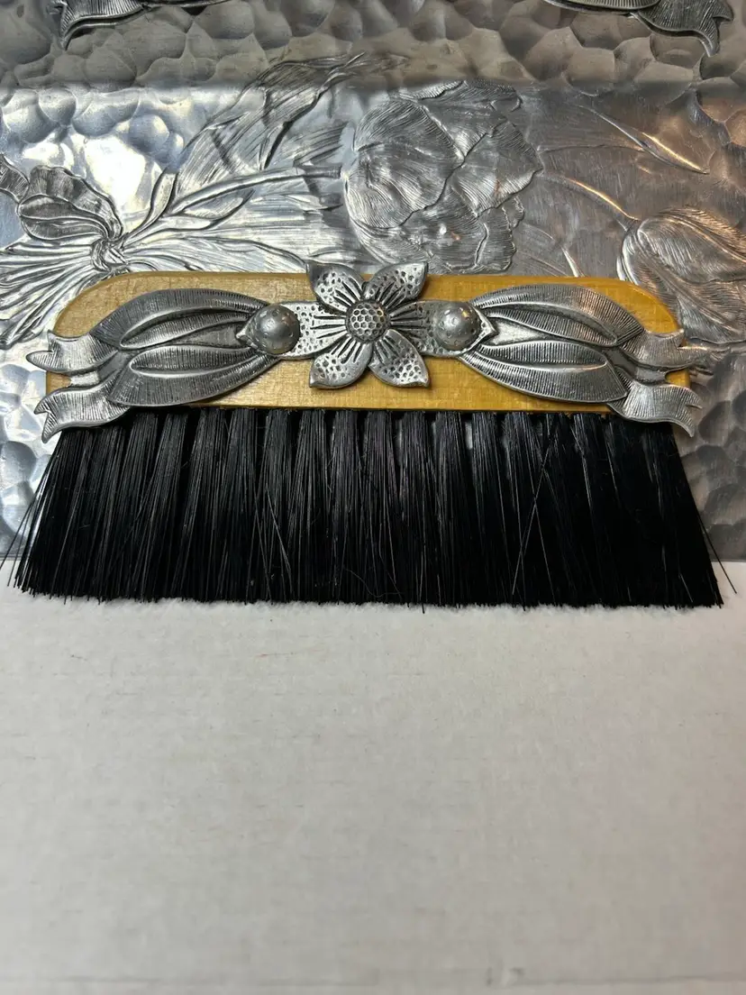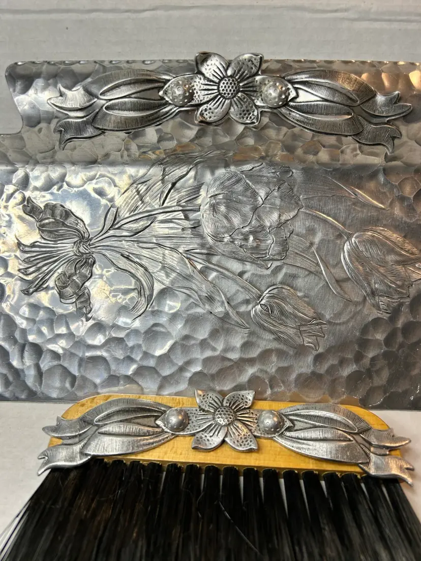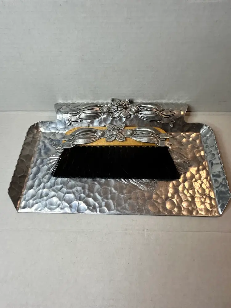 This is a vintage hand-wrought aluminum crumb tray and brush set made by Rodney Kent.