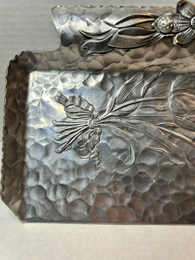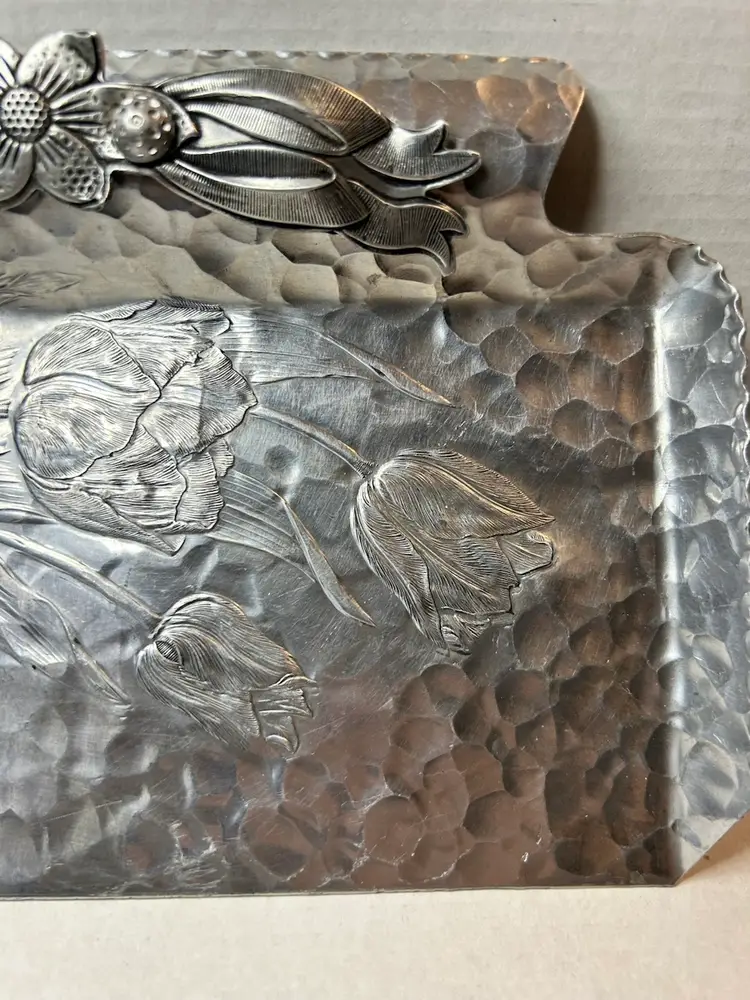 The design features a hammered aluminum finish with a floral pattern of tulips and ribbons.
