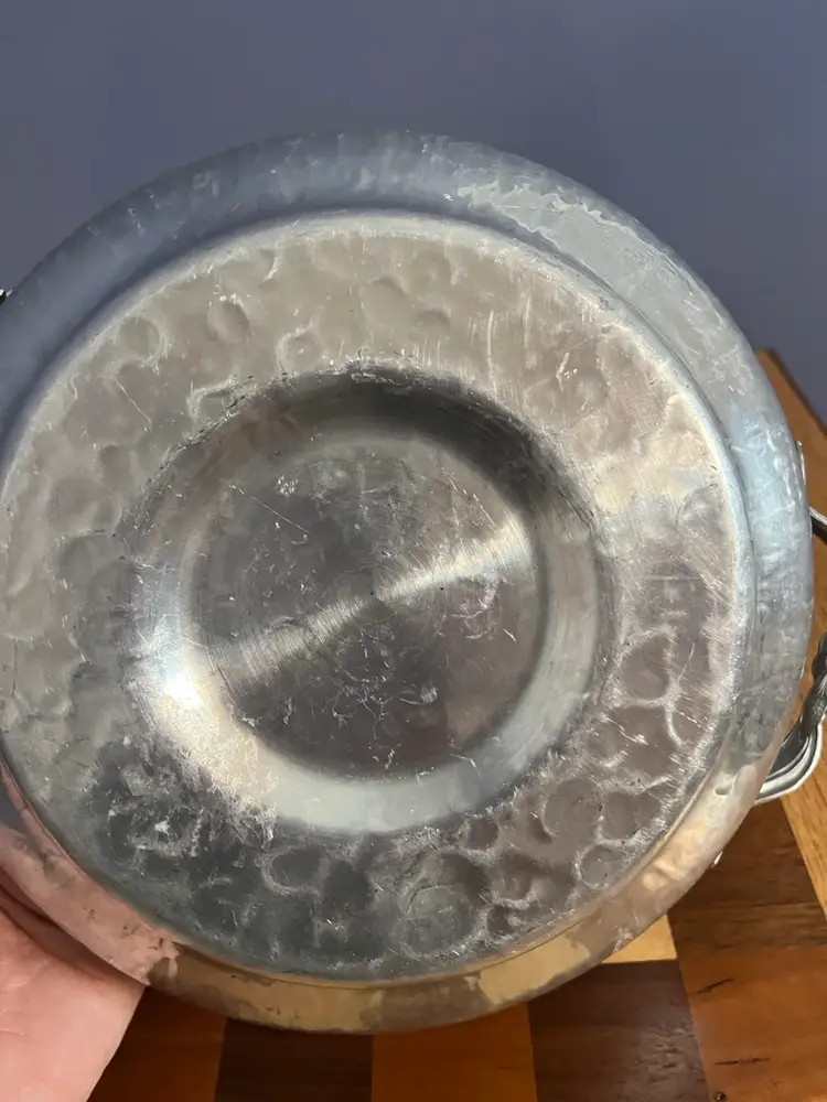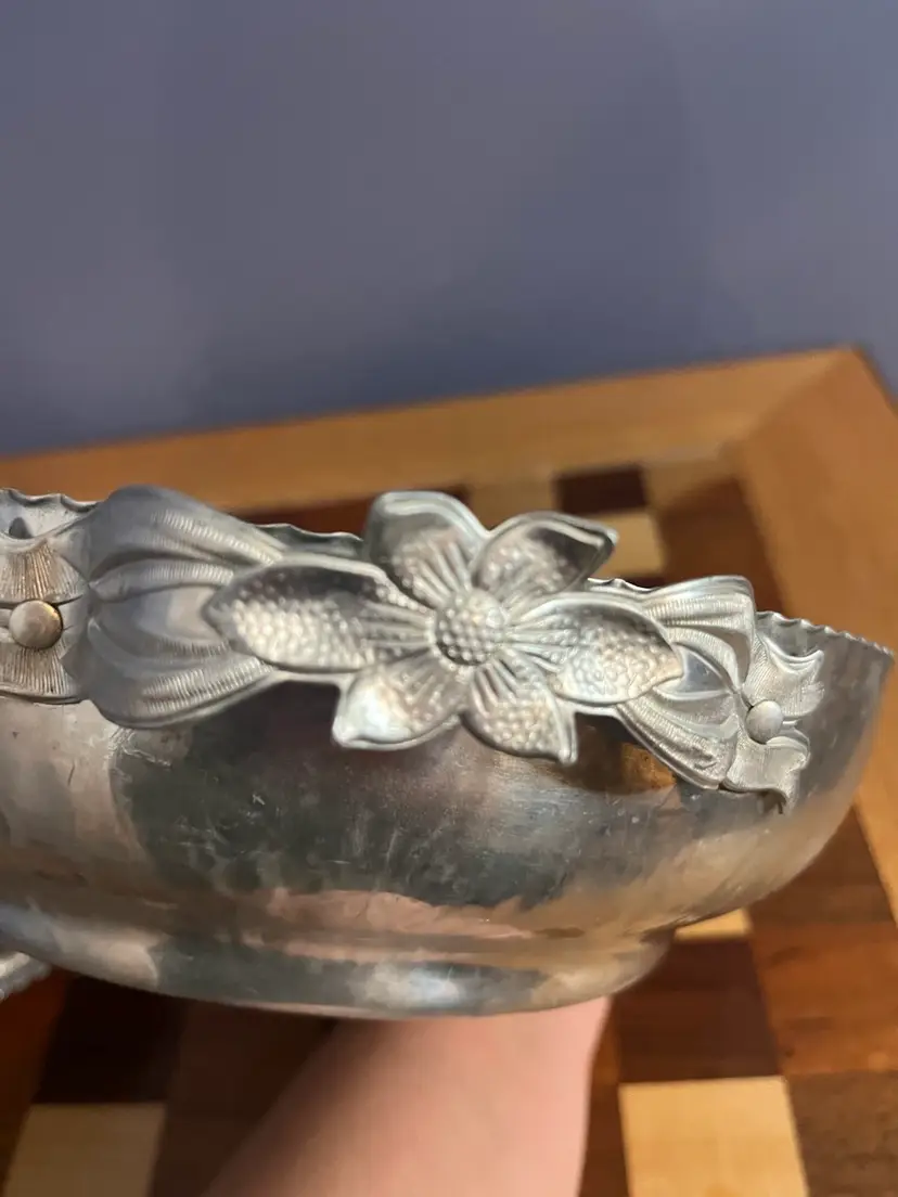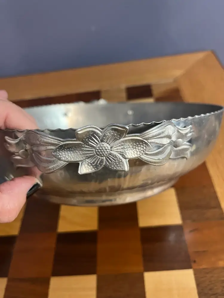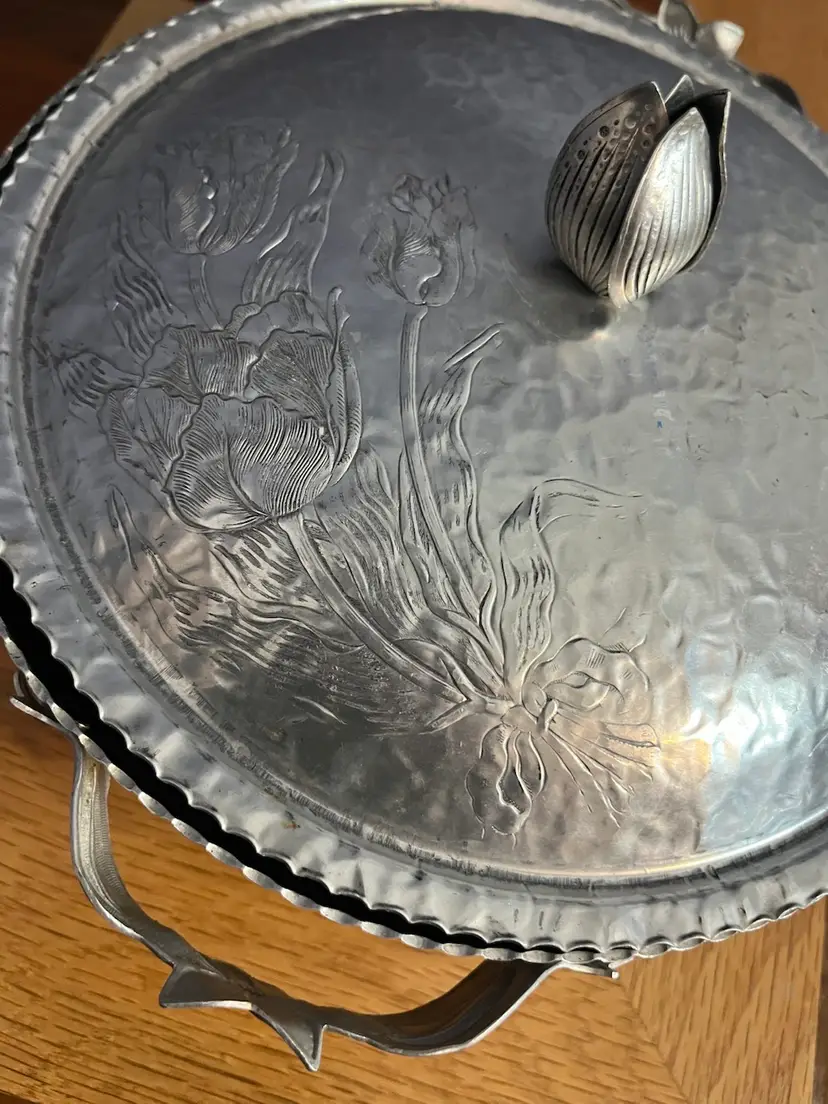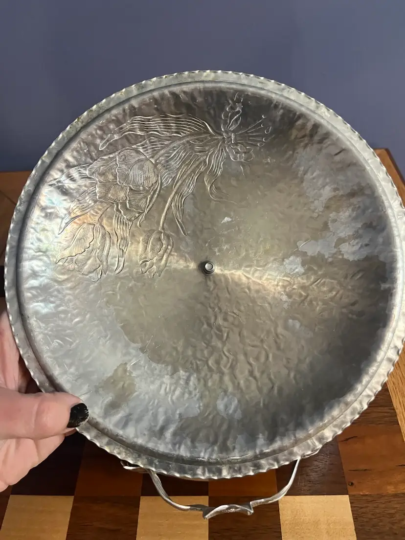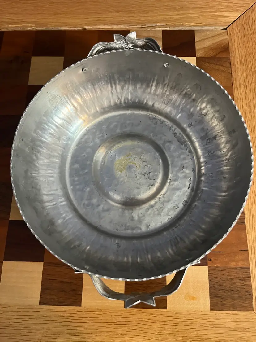 Hammered aluminum ware gained significant popularity in the United States during the mid-20th century, particularly from the 1930s through the 1960s. This type of tableware was appreciated for its rustic charm, durability, and relatively affordable price point compared to sterling silver or plated metals. Many pieces were handcrafted or designed to appear so, often featuring embossed or hand-wrought designs of floral motifs, fruits, or geometric patterns. It was a common choice for everyday use as well as for entertaining, fitting well with mid-century modern and farmhouse aesthetics.