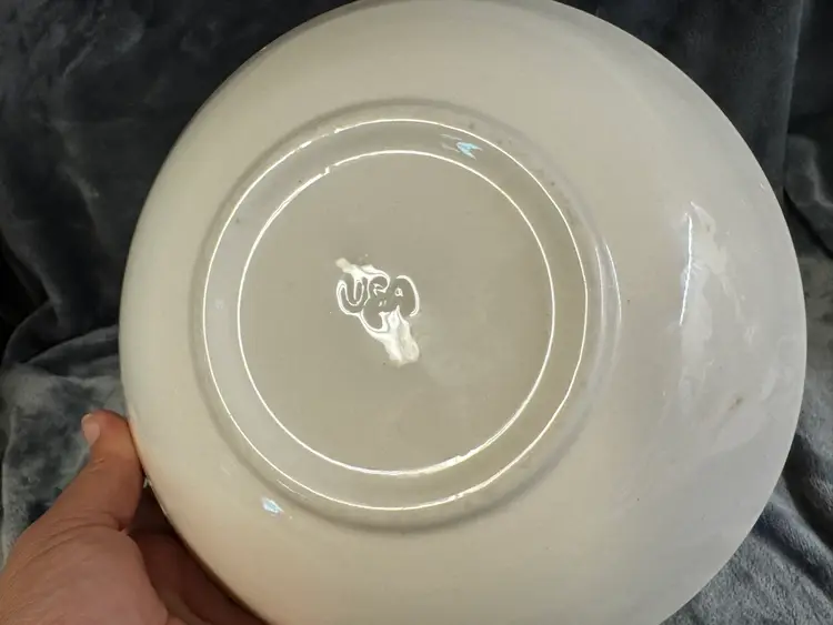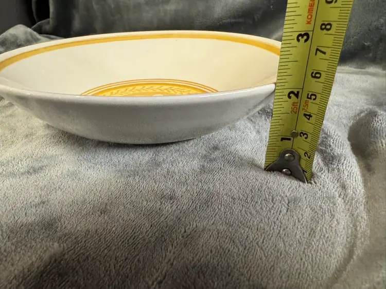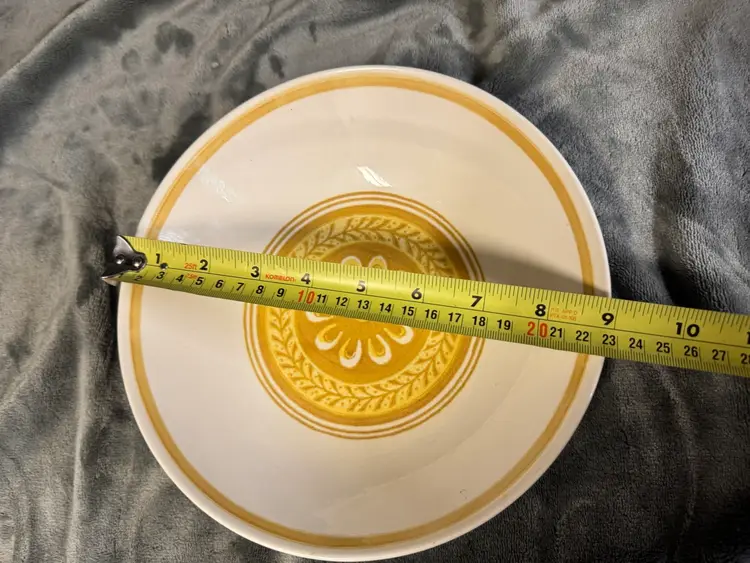 The Vintage Royal China Cavalier Ironstone Serving Bowl Dish in Casablanca Yellow Daisy is a round stoneware bowl with a glossy finish, featuring a mid-century modern style and a vintage flower pattern. This original production piece from America in the late 20th century adds a touch of retro charm to any occasion. Made by Royal China, this 9-inch bowl is perfect for serving and displays a vibrant yellow color that adds a pop of color to any table setting. Excellent condition. No chips, cracks, or crazing. One pockmark in the glaze on underside of bowl.