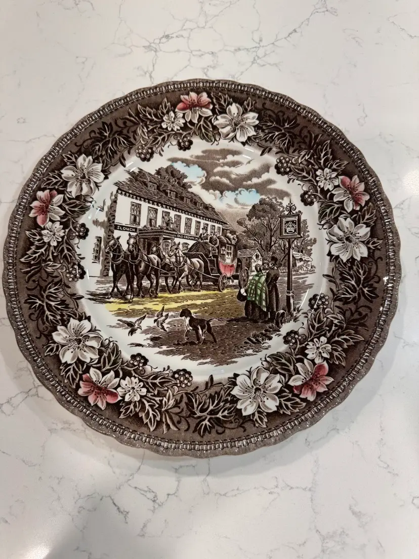 This decorative plate features a classic brown and white transferware design with hand painted pink and white floral accents. This charming plate depicts a lively coaching tavern scene, complete with horse-drawn carriages and figures. It makes a beautiful display piece for collectors of historical or country-style decor. In excellent pre-owned condition, with no chips, cracks, or significant wear.