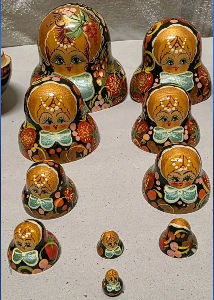 This product is a set of 10 traditional Russian Matroyshka nesting dolls, crafted from wood with intricate hand-painted designs. The dolls are authentically signed by the artist, making them a special piece of folk art from 1998. With their rich cultural significance and handmade craftsmanship, this collection would be a unique and cherished addition to any collector's display. The intricate details and Russian cultural influence make these dolls a standout decorative item for enthusiasts of folk art and cultural artifacts.