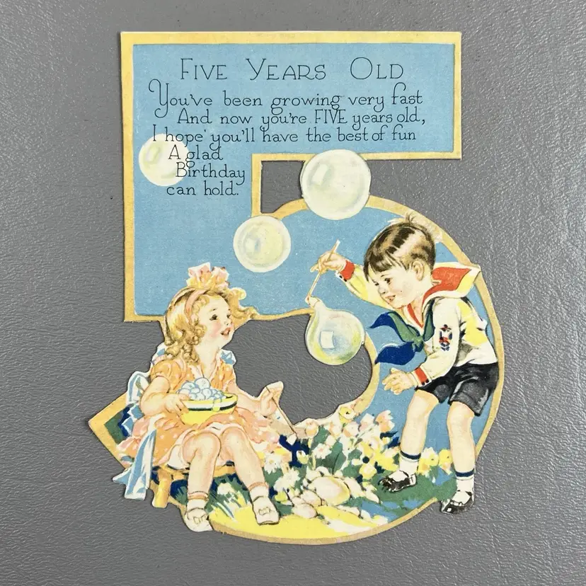 Vintage Rust Craft Die Cut 5th Birthday Card Children Playing With Bubbles USA 3.5x5"