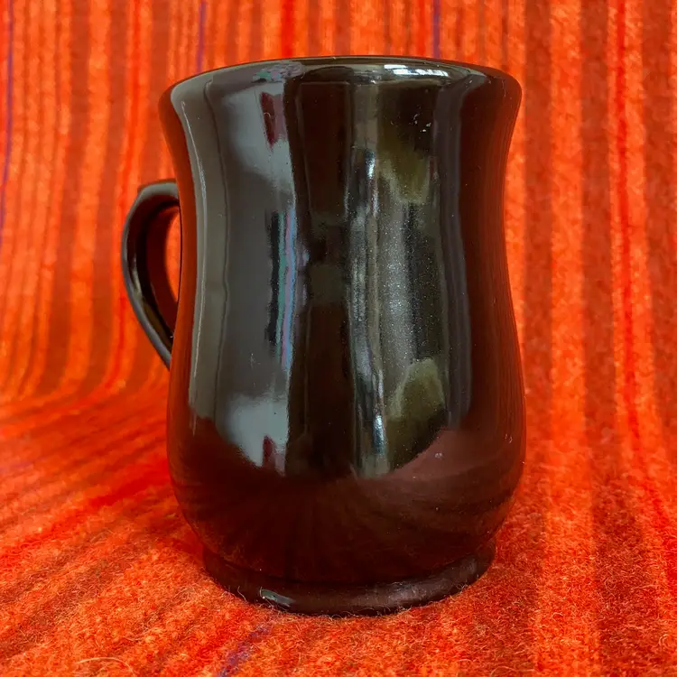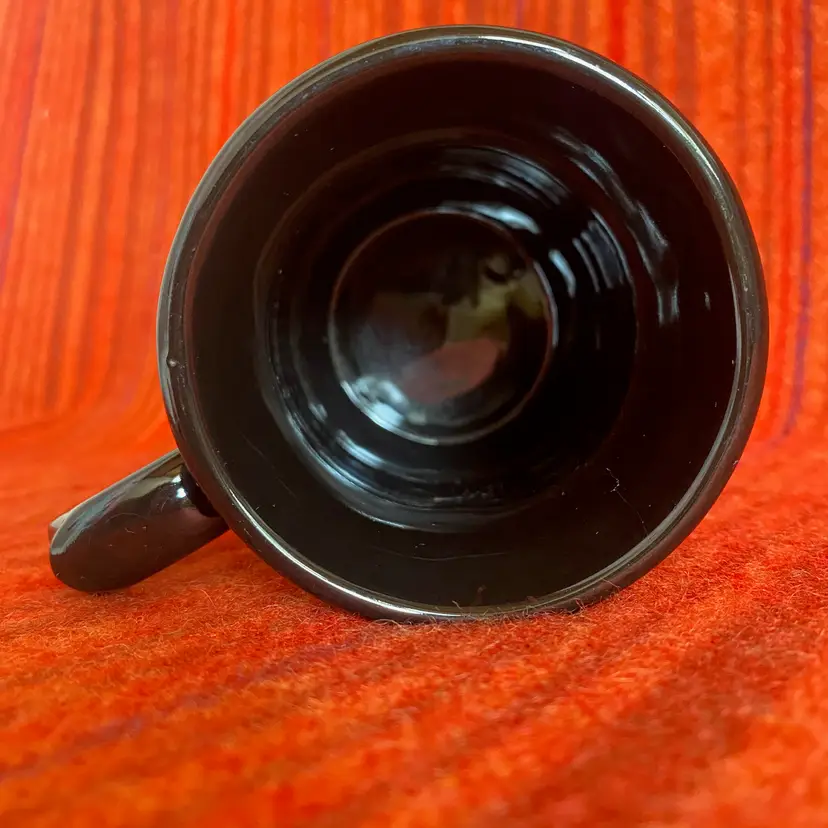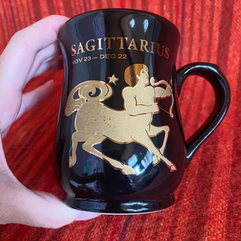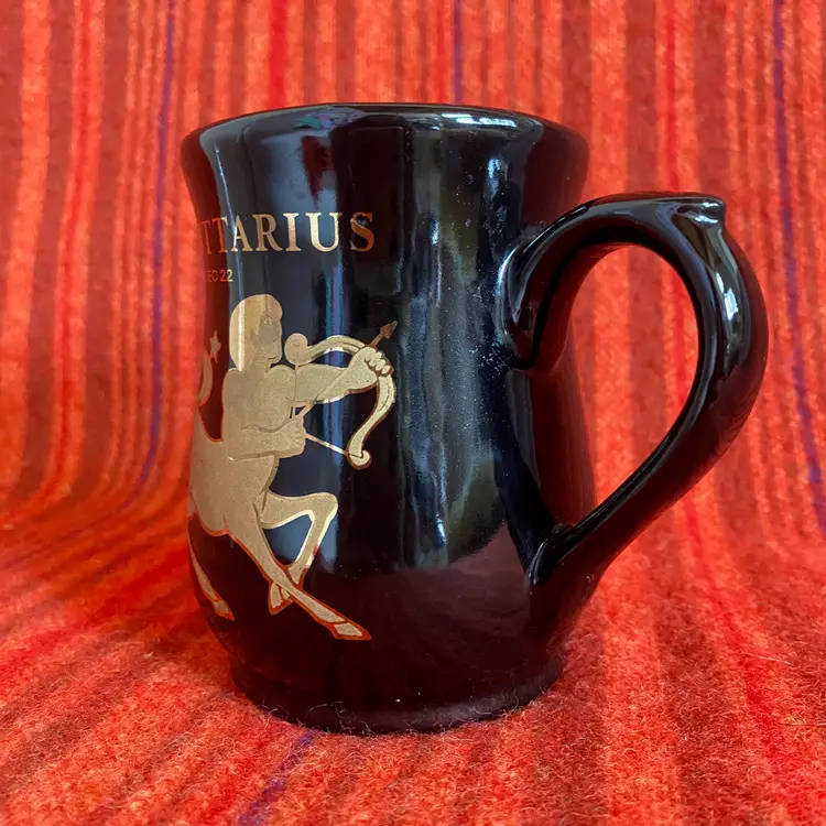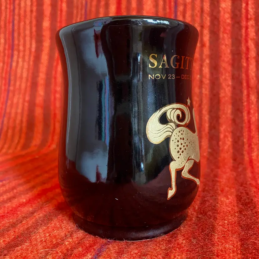 Vintage Sagittarius zodiac black ceramic mug with gold printed archer and lettering. This is taller than standard mugs at 4.5". There are no marks to indicate maker. In excellent condition, no chips and no paint loss.