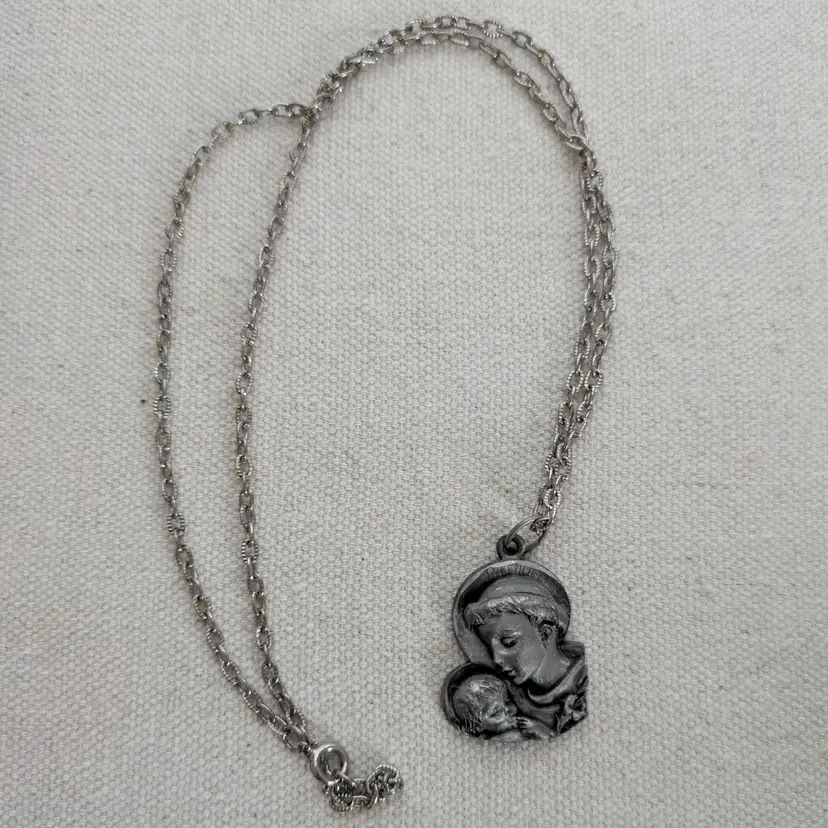This beautiful vintage necklace features a detailed St Anthony and child pendant on a silvertone chain. In good condition. Metal untested.