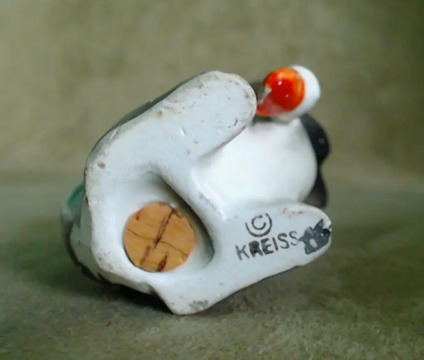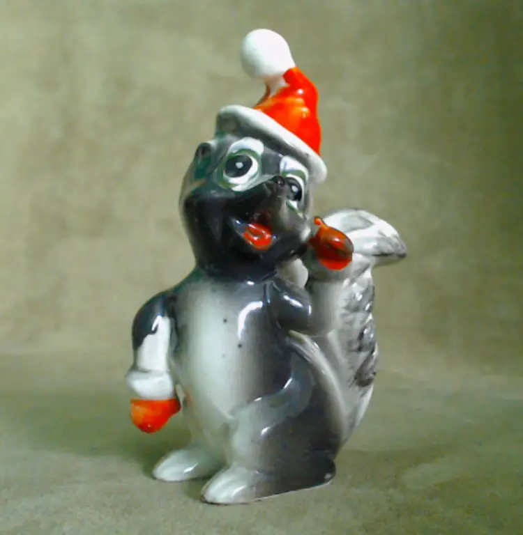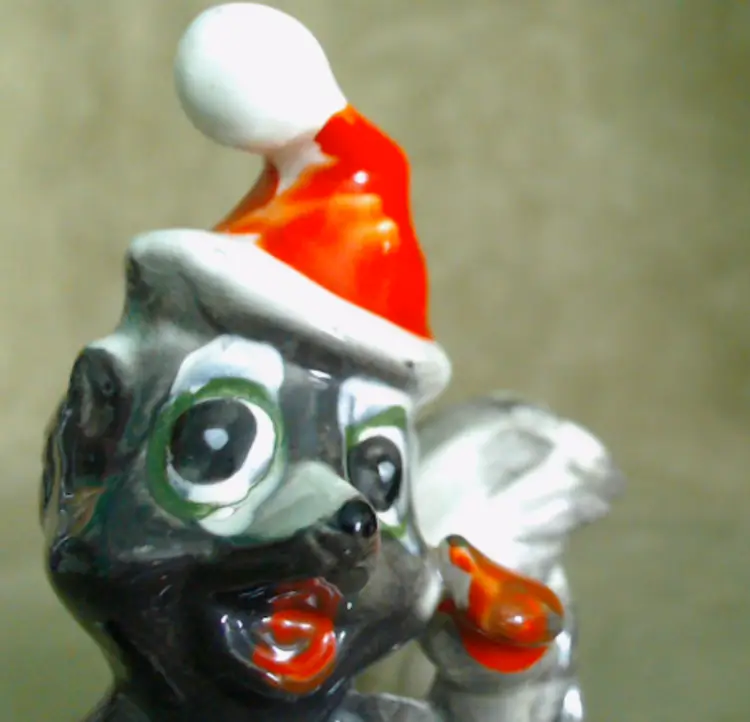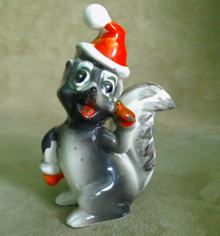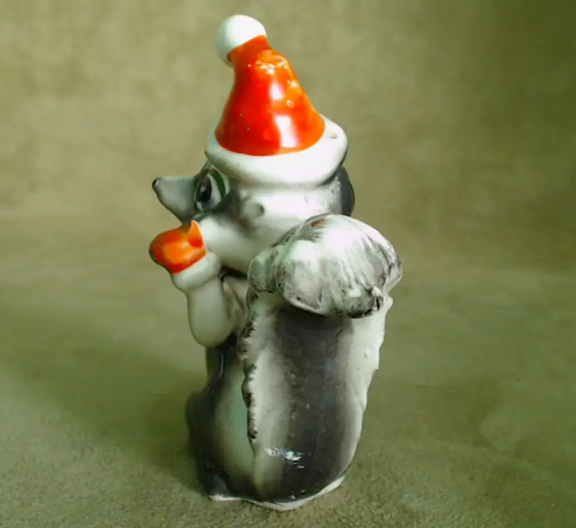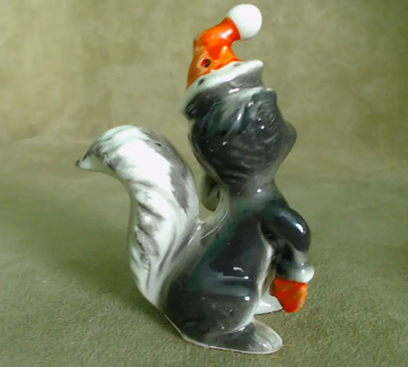 This is a vintage shaker, shaped like a festive skunk! Made in Japan during the early 1960s, for Kreiss & Company, this little stinker was part of a Christmas animal salt and pepper shaker series. Obviously he'd be a perfect replacement if you're looking to complete the set, but he'd also be great to display as a figurine, or to use in a holiday crafting project! Condition: This little guy is in Excellent shape! He has no chips, cracks, or any other damage that I could find. His cold-paint is as good as the day he was made, the only missing spots are the ones they overlooked in the factory! He even has his original cork stopper. Size: He measures just over 1" across, is about 2¼" front to back, and stands just over 3½" tall.
