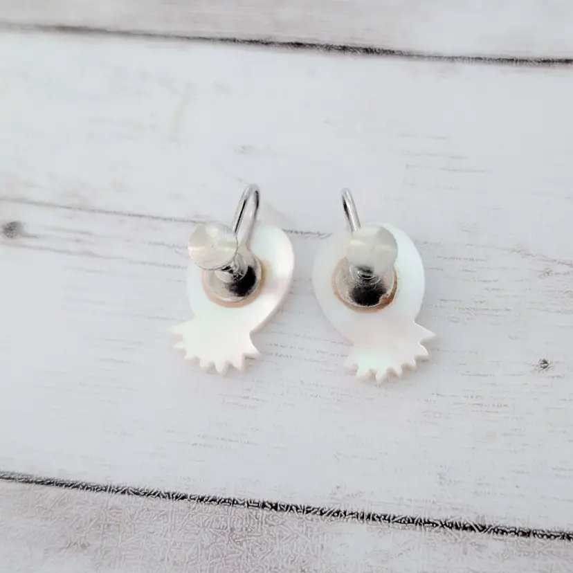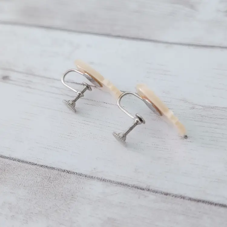 These earrings measure just over 0.75". Not sure of material but has a slight iridescent sheen. Glue visible to rear. Some marks and signs of wear to screw backs.