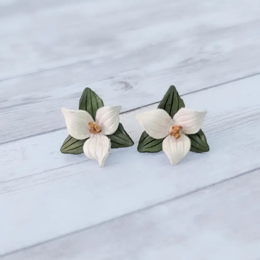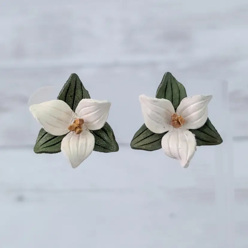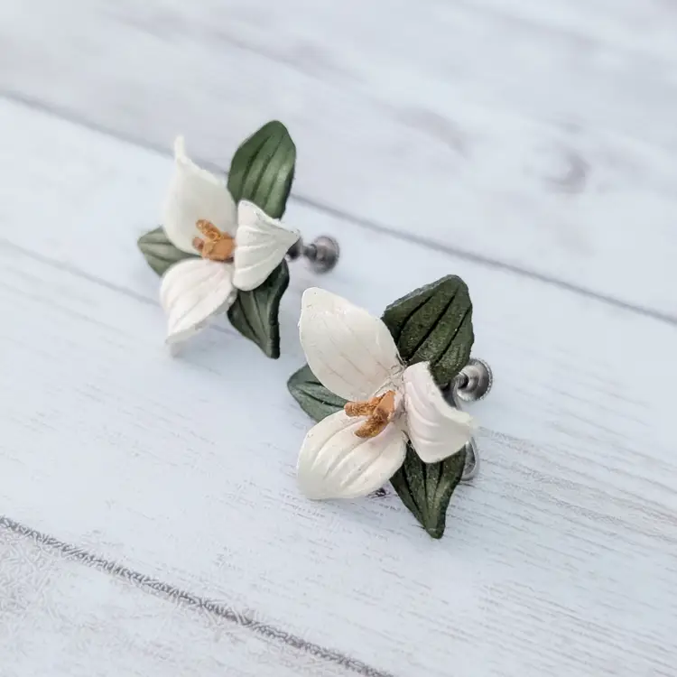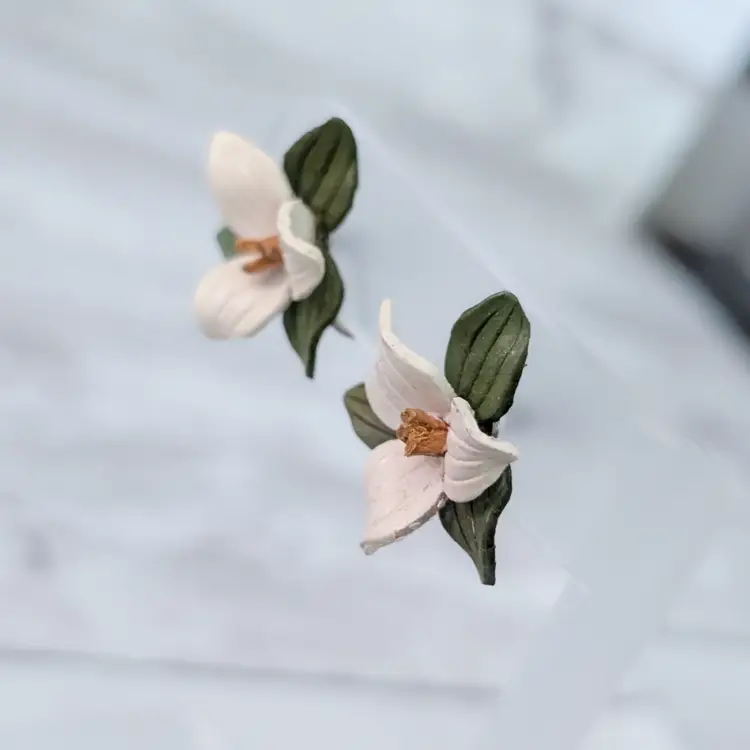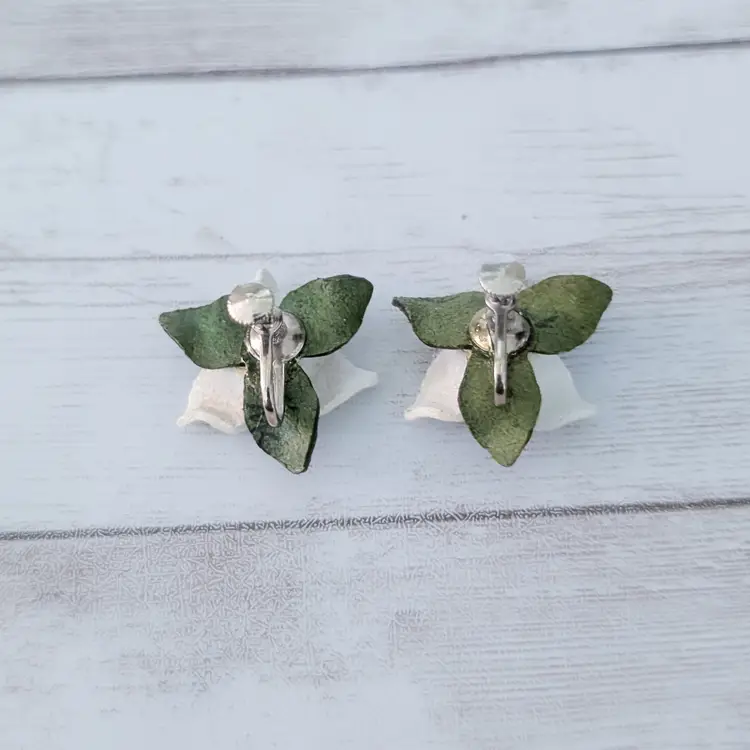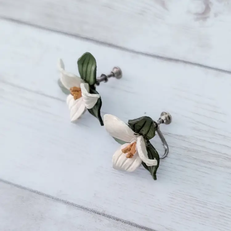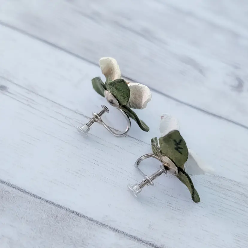 These earrings measure about 7/8". Some discoloration to edges of cream petals. Some marks to the front. Rear has some marks and signs of wear. Some wear to screws. Some glue visible to rear.