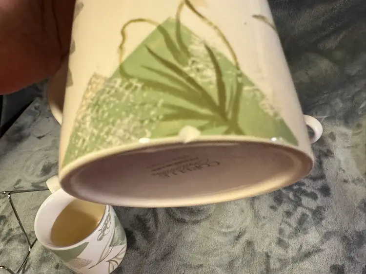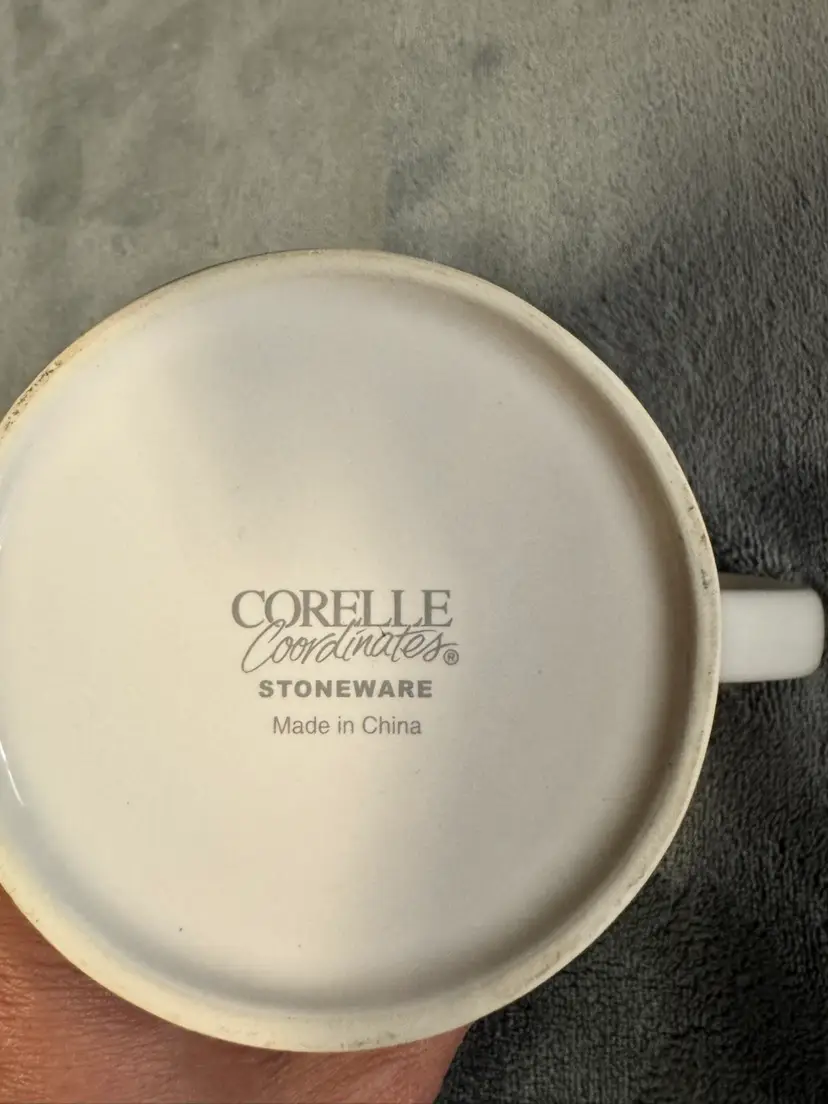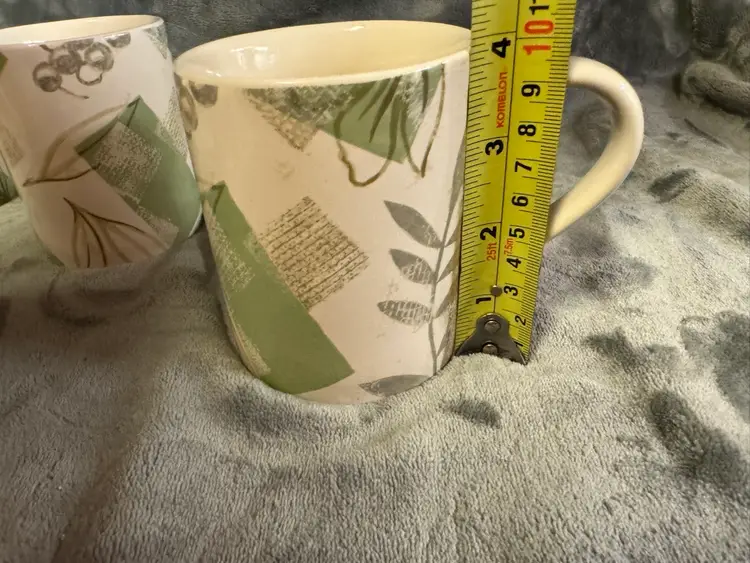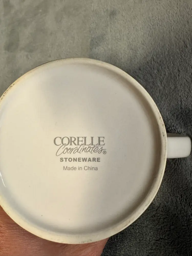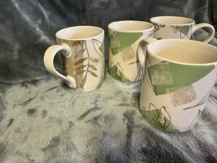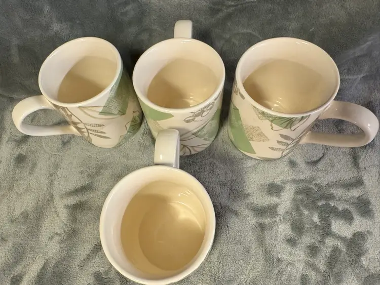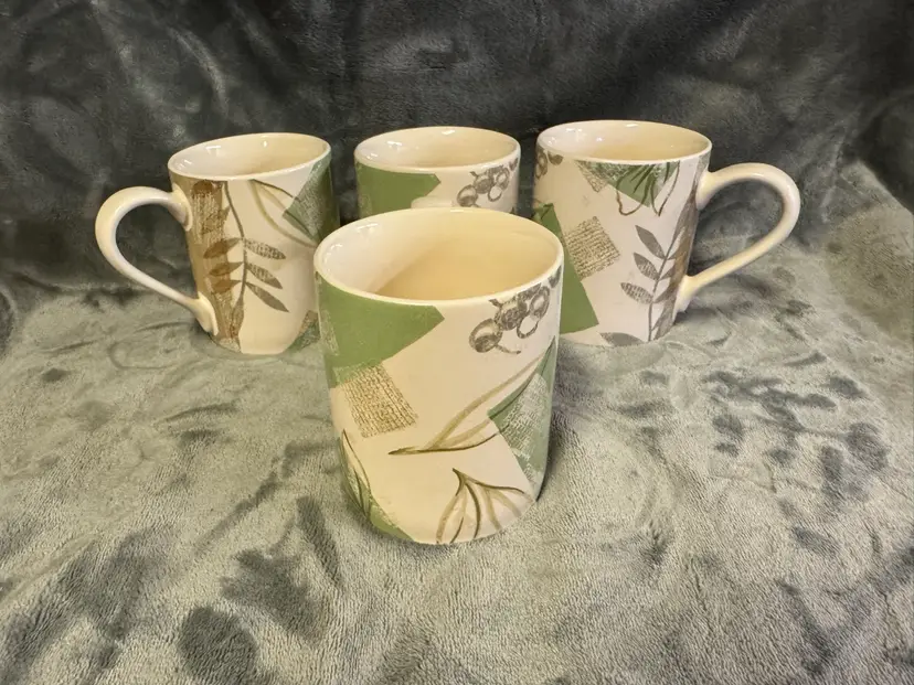 This vintage set of four Corelle Coordinates “textured leaves” coffee cups/mugs in green leaf pattern with acorns are a charming addition to any kitchen. Made of stoneware with a glossy finish, these round mugs feature a retro style and are dishwasher safe for easy cleaning. Perfect for all occasions, these mugs stand at 4" in height and have a diameter of 3.25", making them suitable for adults of any gender. The textured leaves design adds a unique touch to the original Corelle product line, making them a delightful collectible for those who appreciate vintage pieces. Three cups in excellent condition with no chips, cracks, crazing, or stains. One cup is chipped on the rim (see photo).