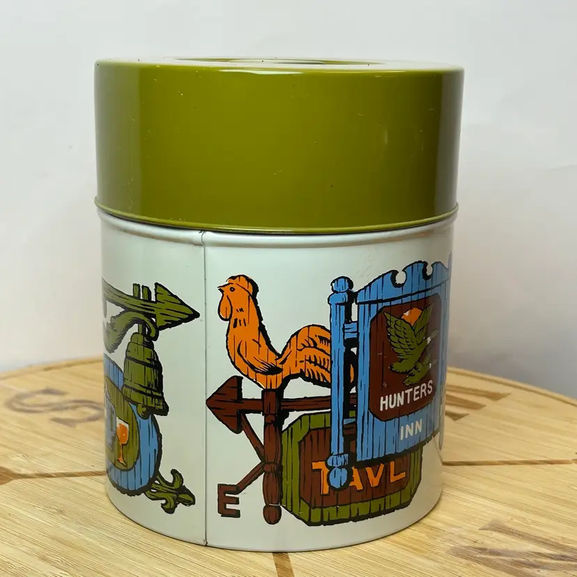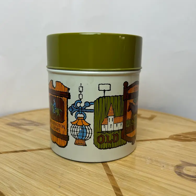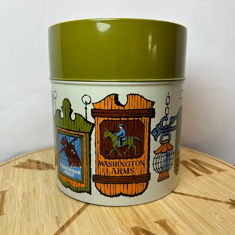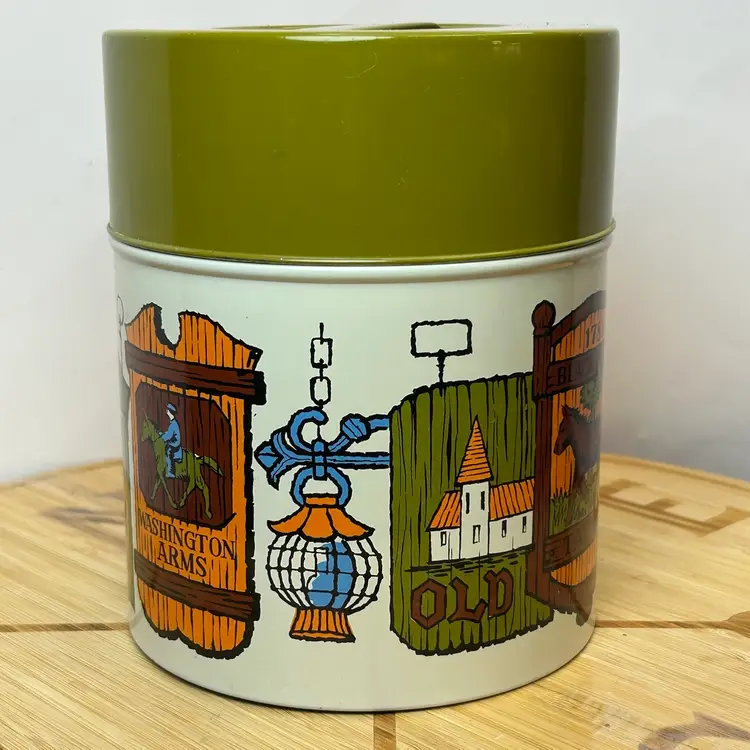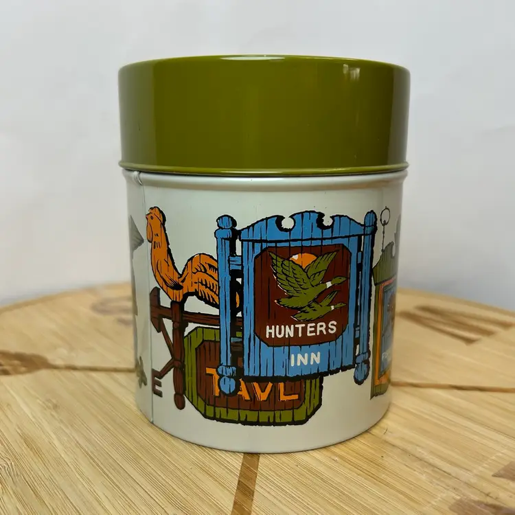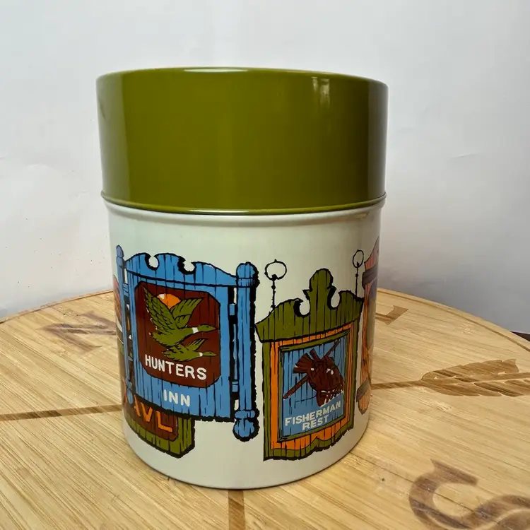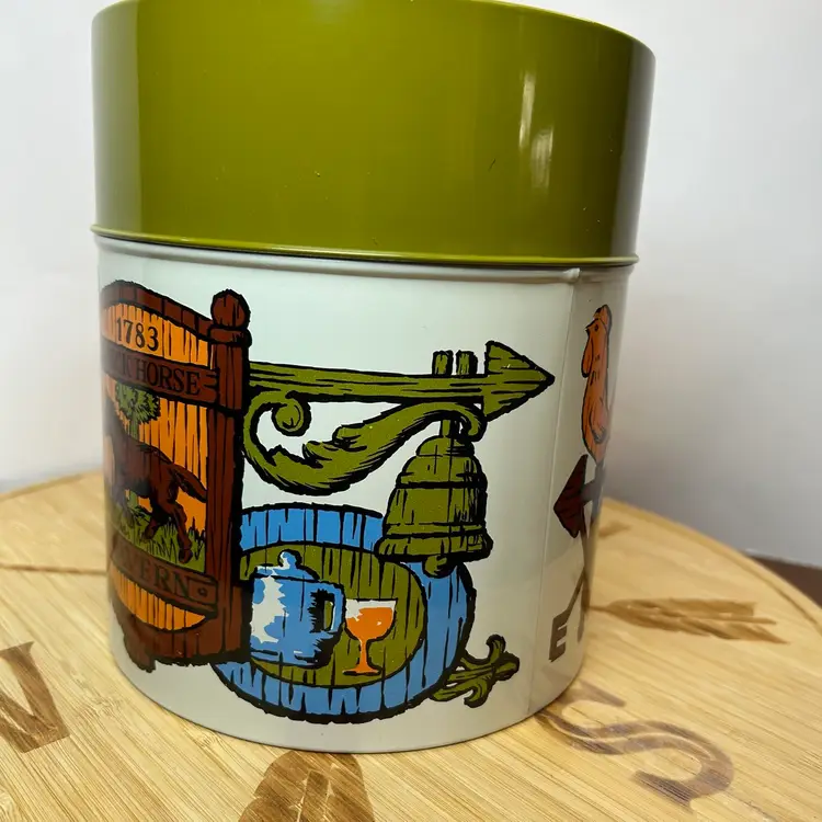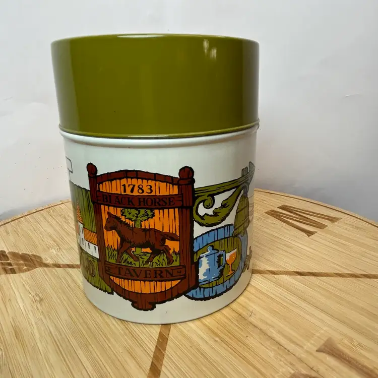The designs include painted illustrations of taverns with names such as "HUNTERS INN," "FISHERMAN REST," and "WASHINGTON". Insides and outsides are in excellent condition. Four nesting sizes range from smallest (4.5” tall, 3.75” diameter) to largest (7” tall, 6” diameter). With to intermediate sizes (5” tall, 4” diameter), and (6” tall, slightly less than 5” diameter).